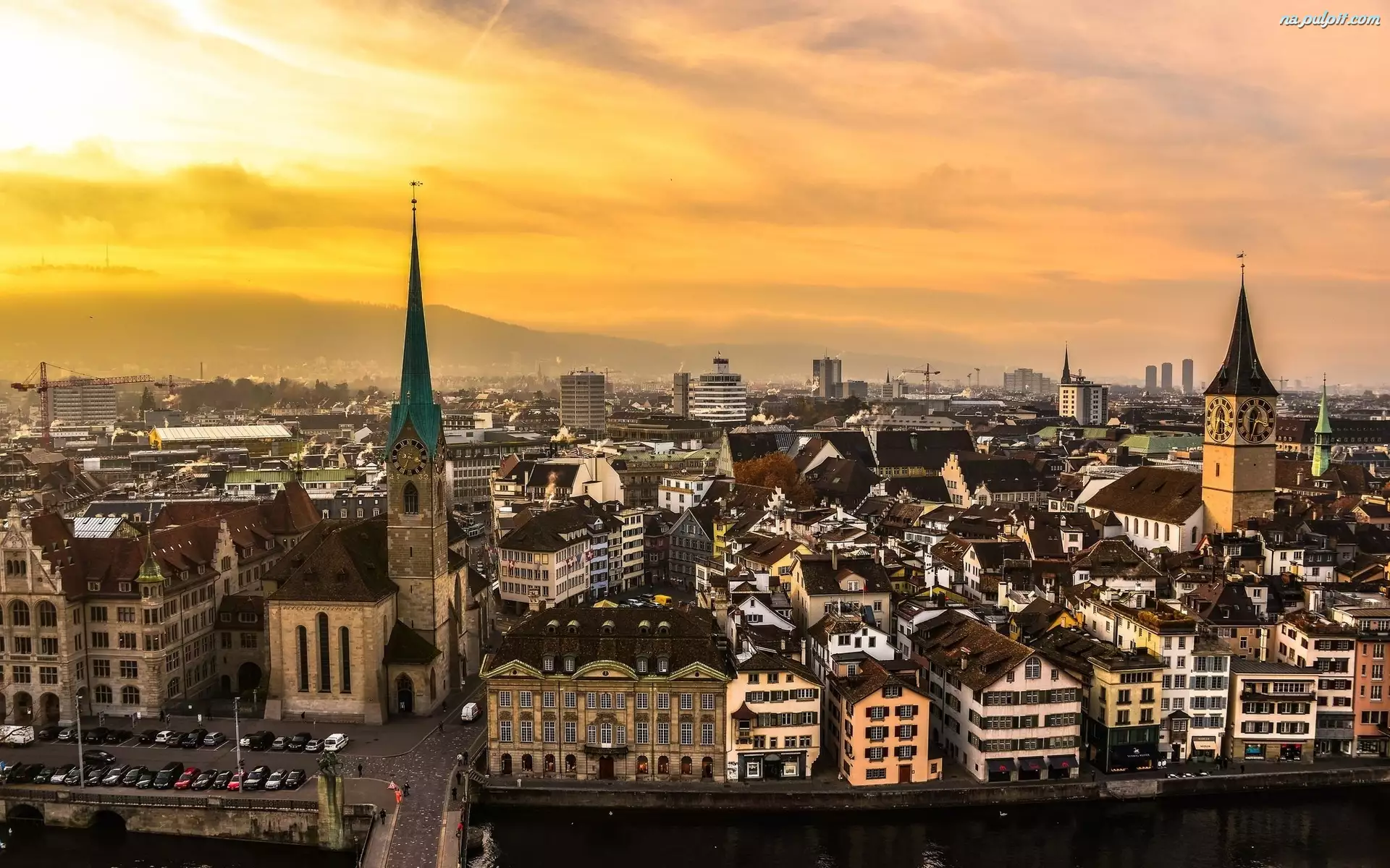 Zachód, Słońca, Miasta, Domy, Panorama, Szwajcaria, Zurych