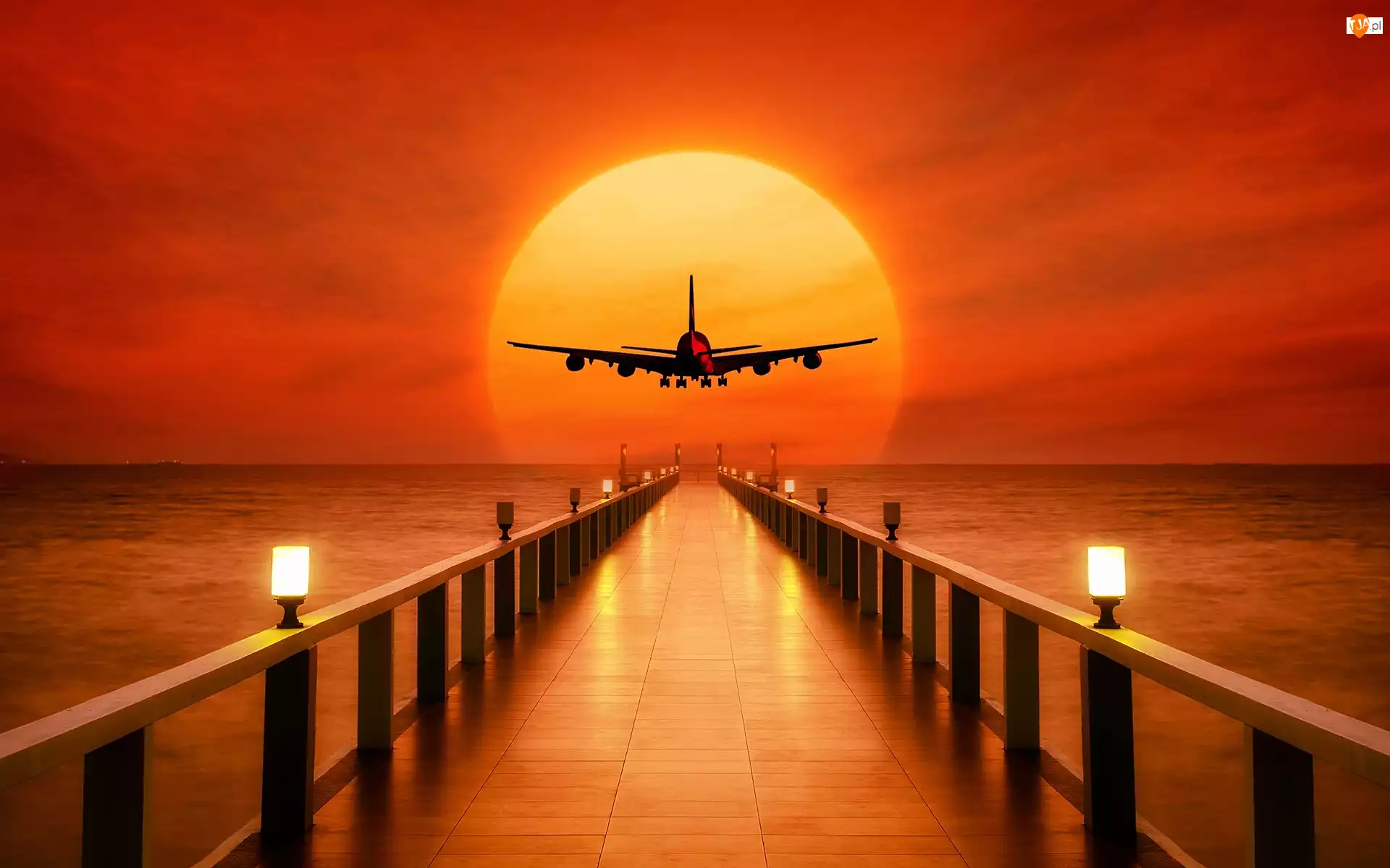 Zachód słońca, Morze, Lampy, 2D, Molo, Samolot