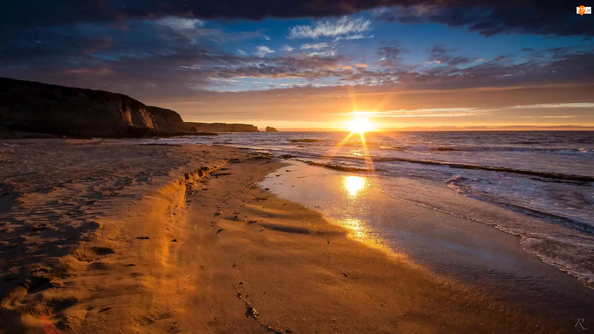 Promienie słońca, Zachód słońca, Plaża, Morze