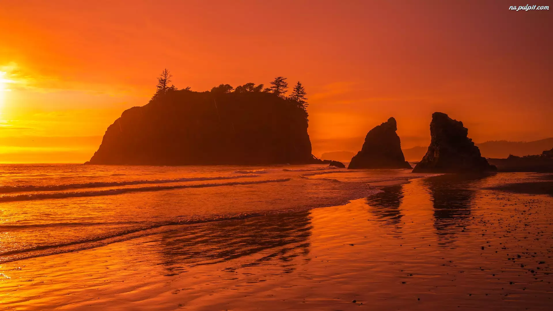 Park Narodowy Olympic, Morze, Zachód słońca, Stan Waszyngton, Plaża, Skały, Stany Zjednoczone, Ruby Beach