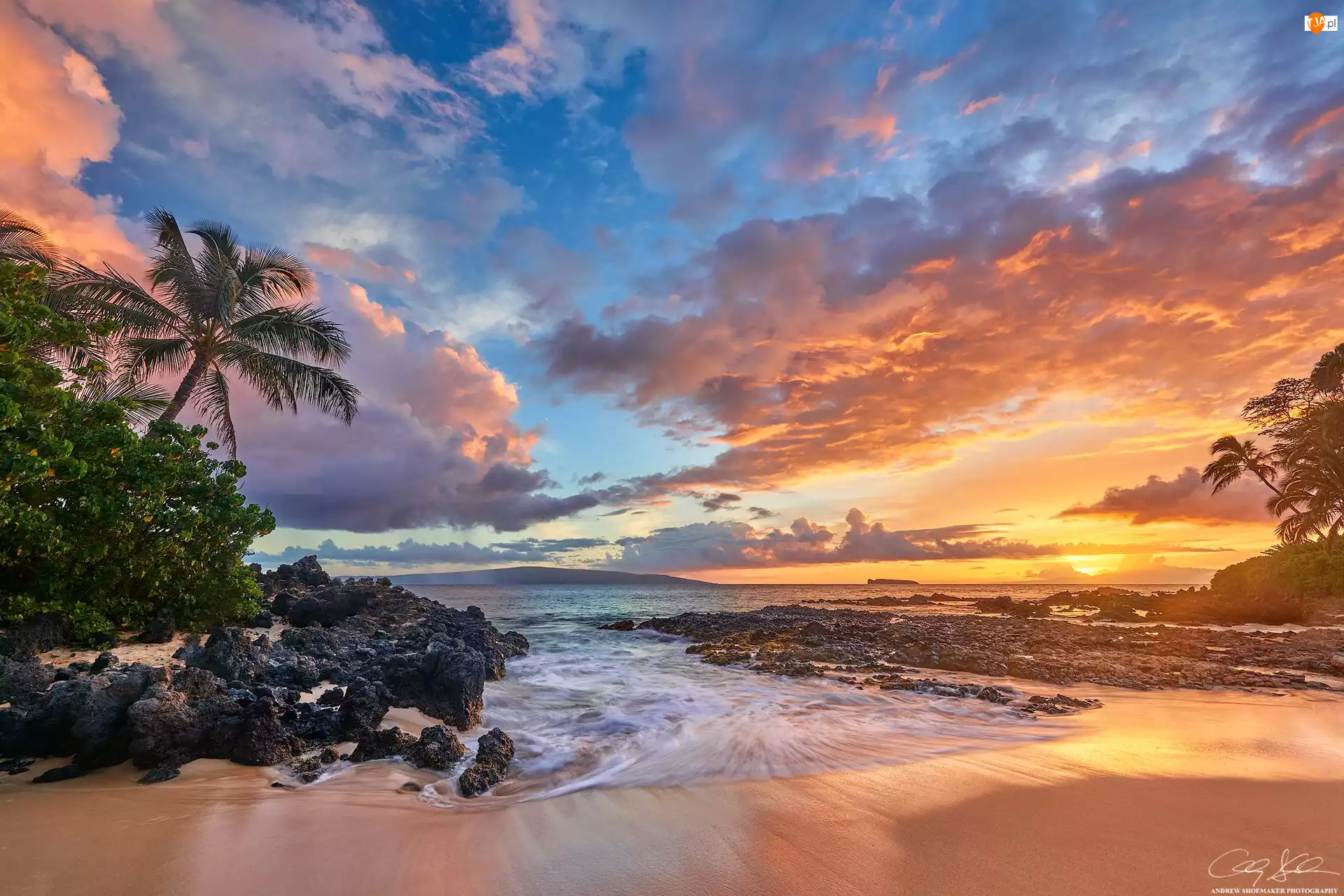 Morze, Palmy, Hawaje, Plaża, Wyspa Maui, Zachód słońca