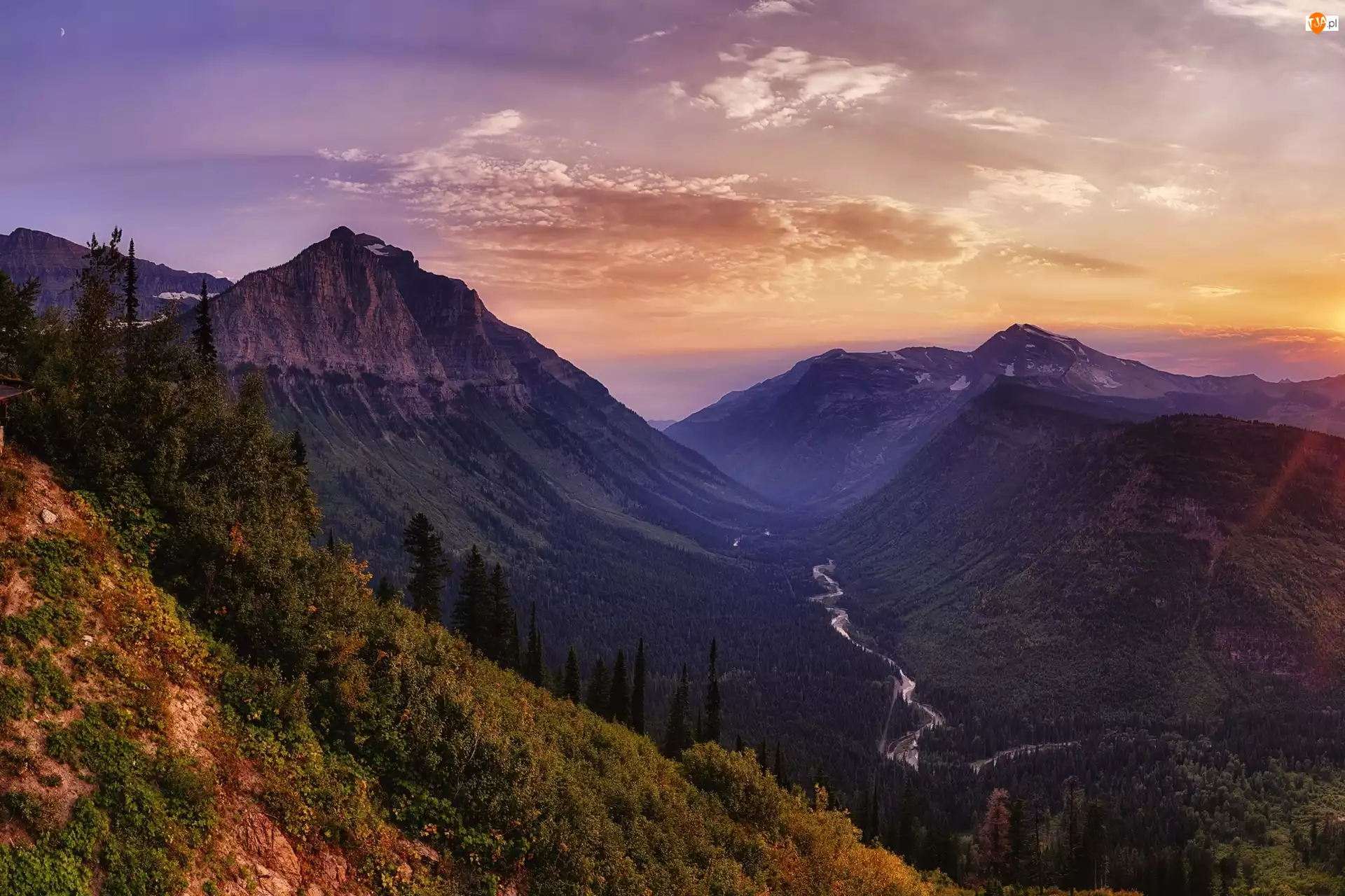 Stan Montana, Park Narodowy Glacier, Zachód słońca, Stany Zjednoczone, Las, Rzeka, Góry