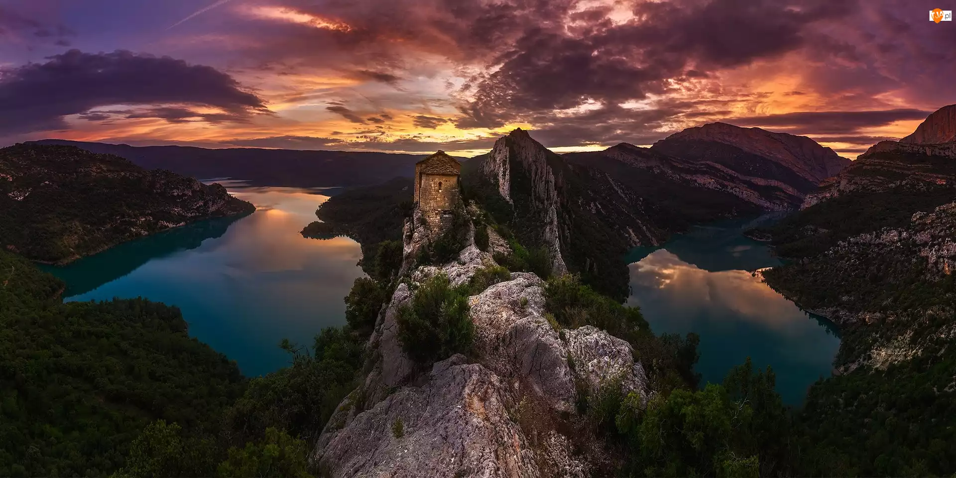 Skały, Jeziora, Góry, Zachód słońca, Wieża