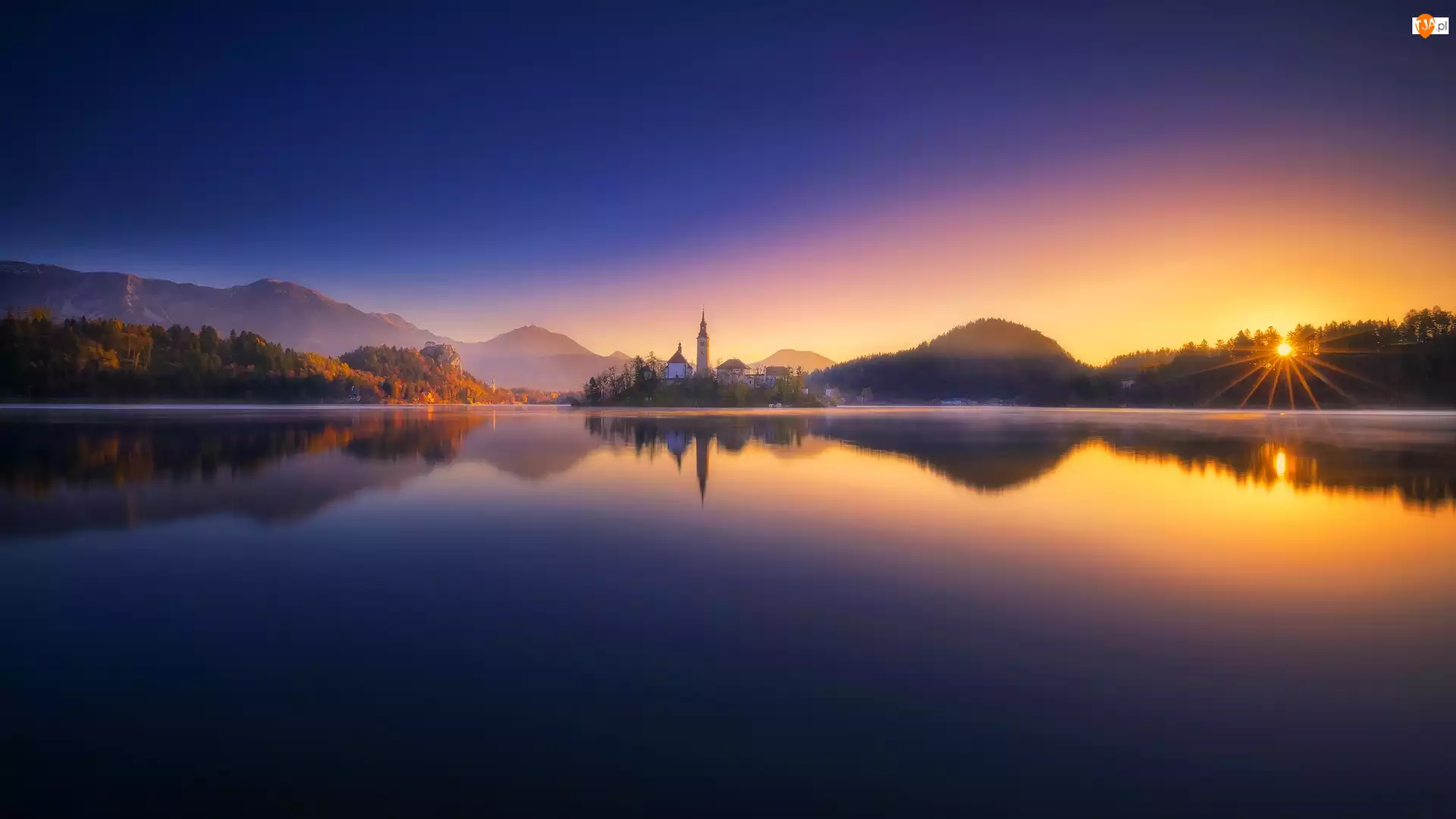 Wyspa Blejski Otok, Góry Alpy Julijskie, Promienie słońca, Słowenia, Zachód słońca, Kościół Zwiastowania Marii Panny, Jezioro Bled