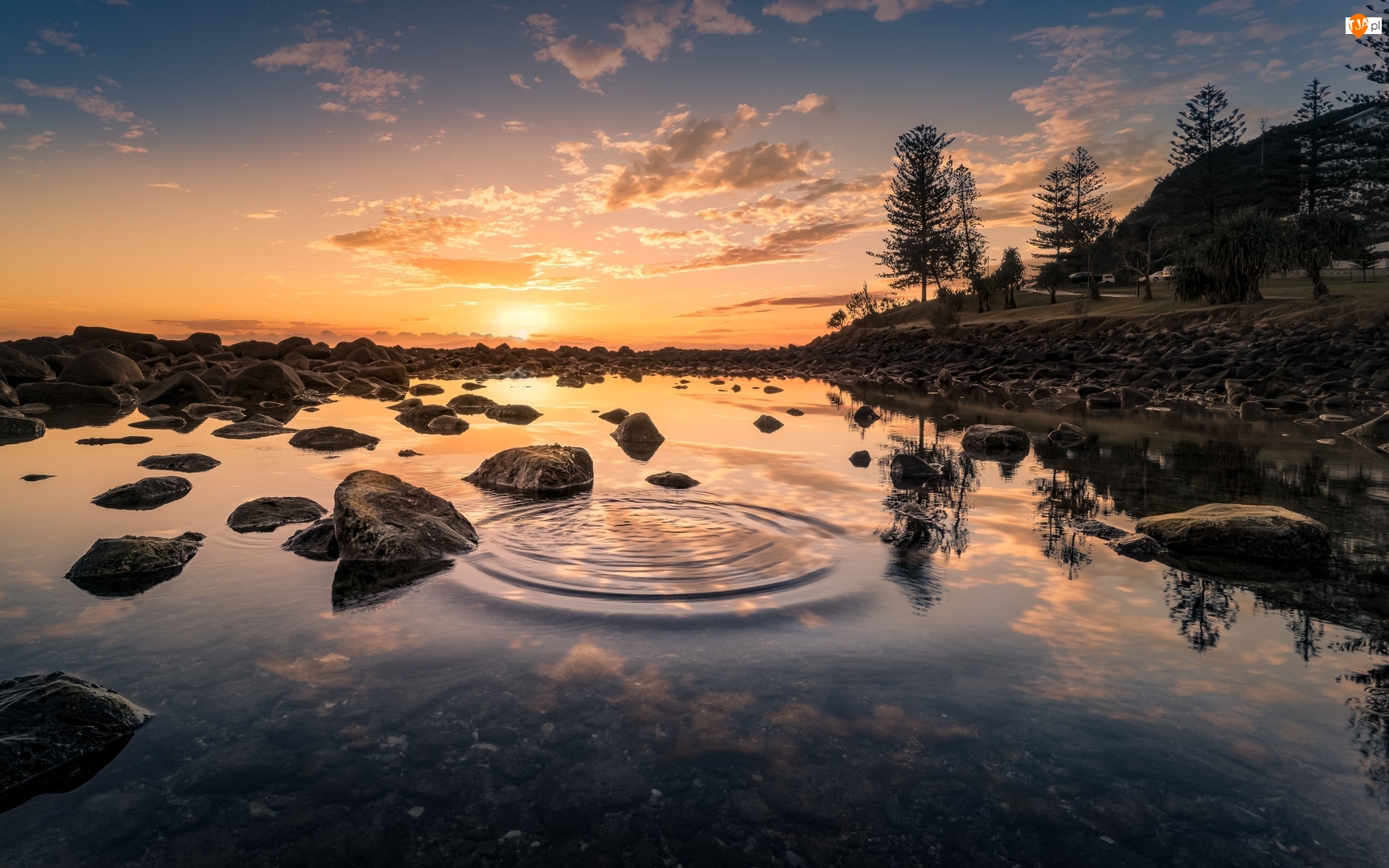 Zachód słońca, Drzewa, Jezioro, Kamienie