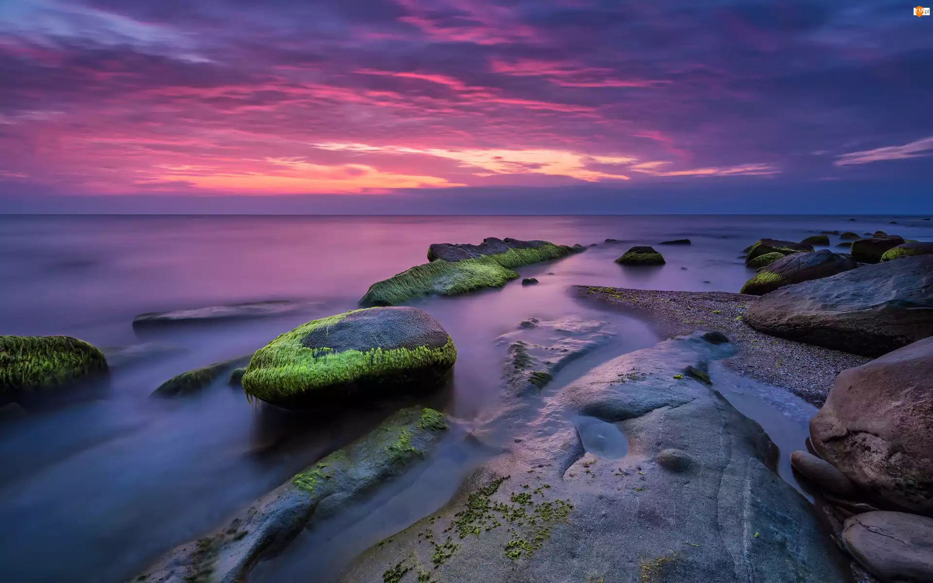 Zachód słońca, Morze, Omszałe, Kamienie