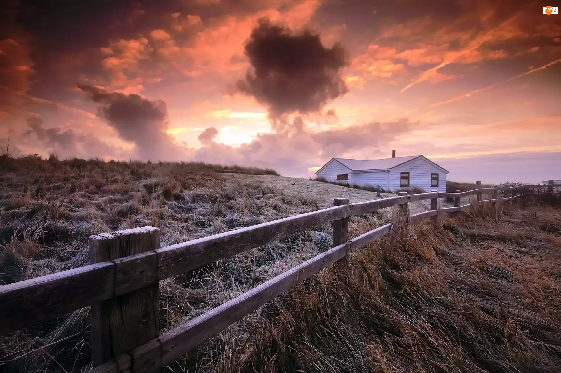Chmury, Zachód słońca, Łąka, Ogrodzenie, Dom, Szron
