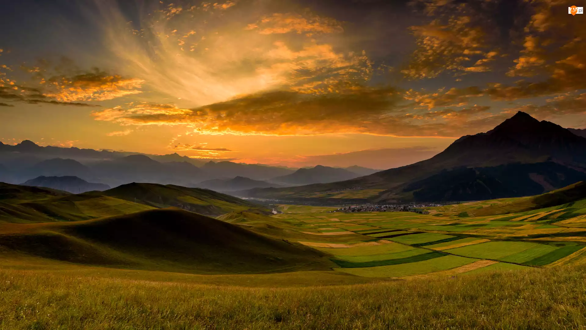 Zachód słońca, Wzgórza, Chiny, Pola Chiny, Góry Qilian Shan, Chmury