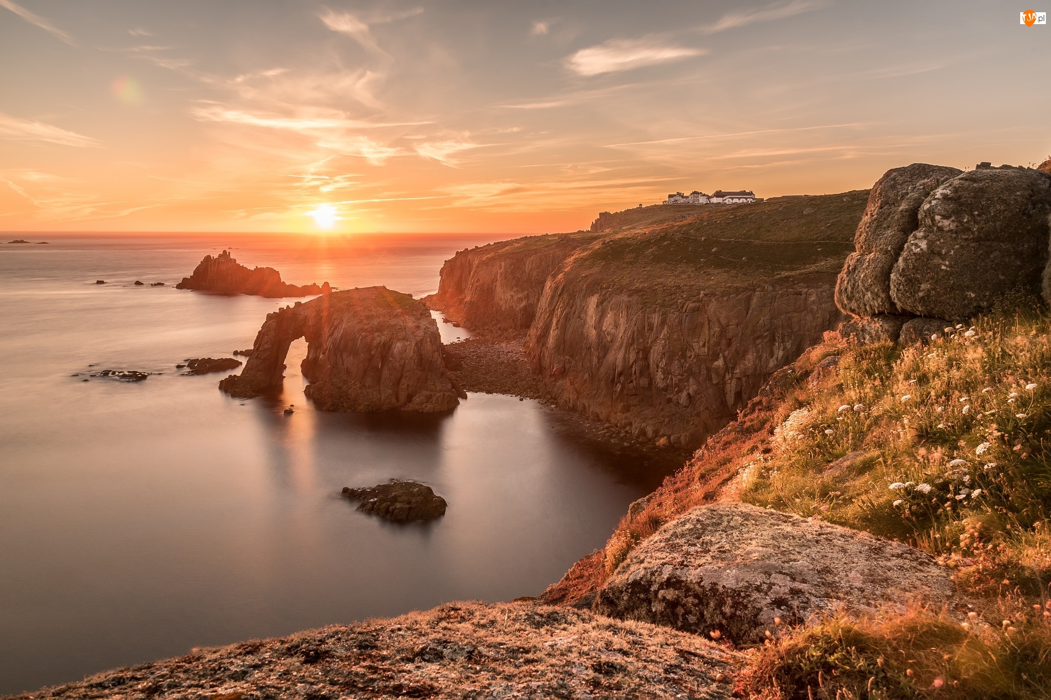 Anglia, Morze, Kornwalia, Enys Dodnan Arch, Przylądek Lands End, Skały, Zachód słońca, Wybrzeże, Punkt widokowy