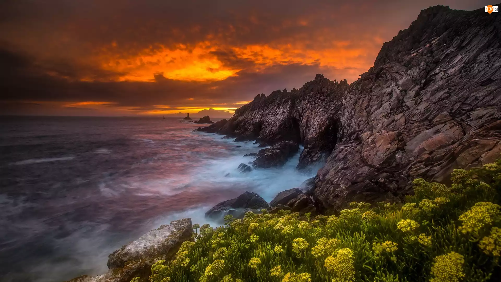 Roślinność, Chmury, Skały, Morze, Zachód słońca