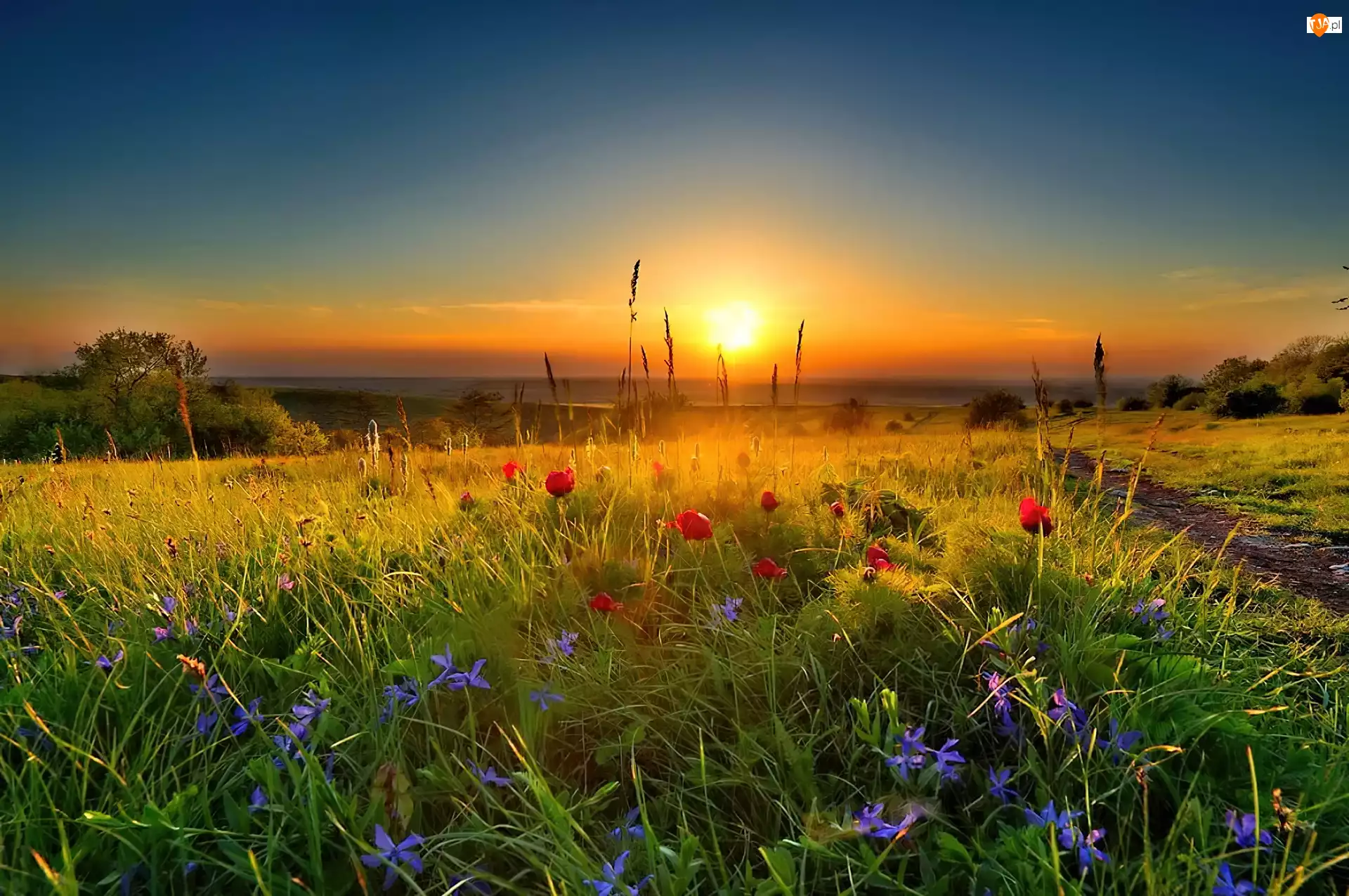 Zachód Słońca, Niebo, Łąka, Maki