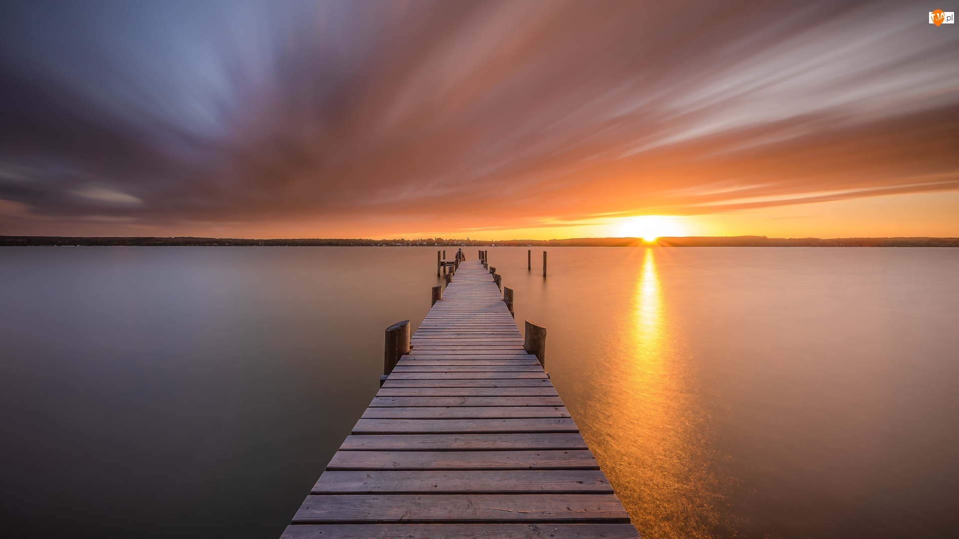 Zachód słońca, Niemcy, Pomost, Jezioro Ammersee, Bawaria