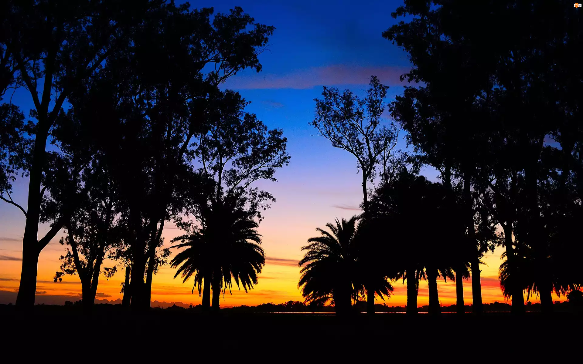 Zachód słońca, Palmy, Drzewa