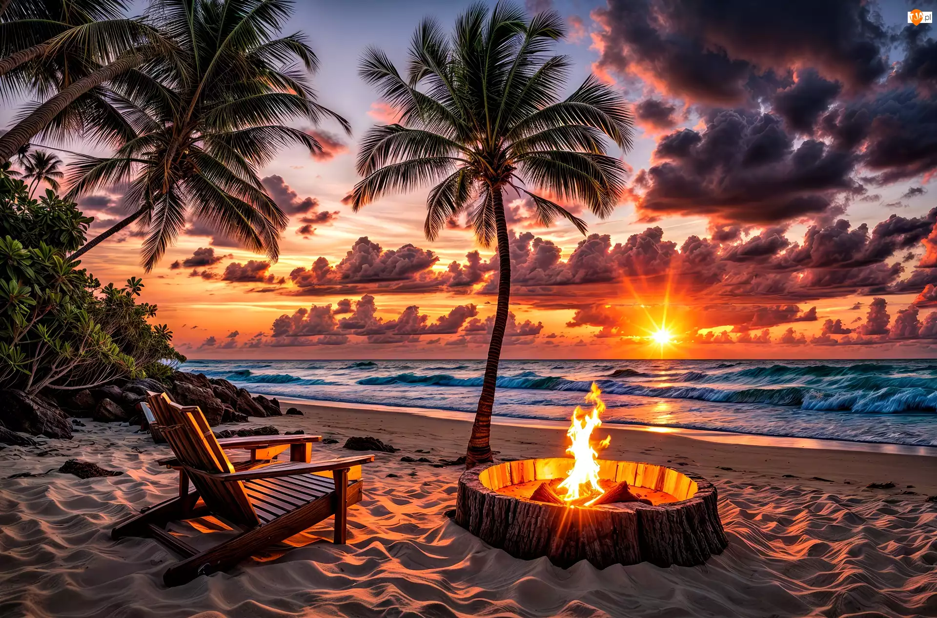 Zachód słońca, Plaża, Palmy, Chmury, Leżak, Morze, Grafika, Ognisko
