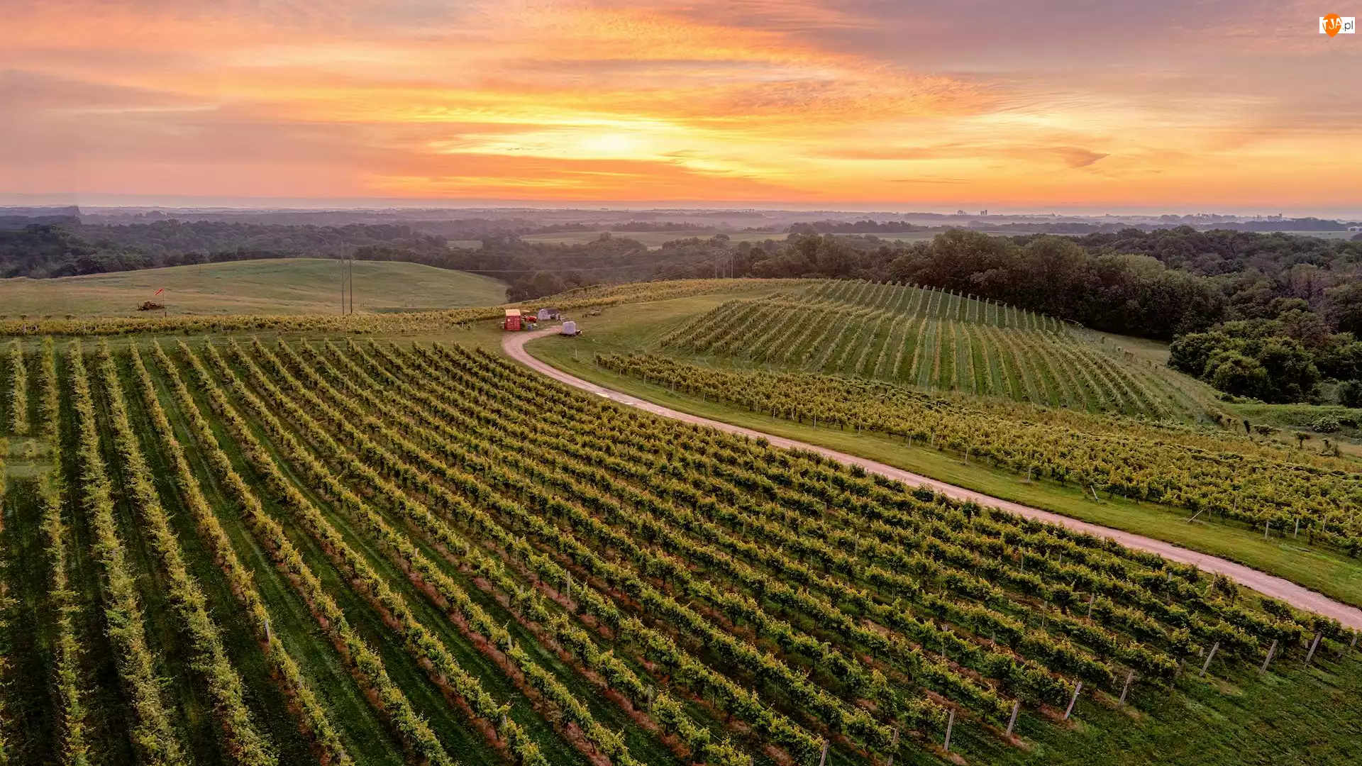 Zachód słońca, Pola uprawne, Wzgórza, Droga