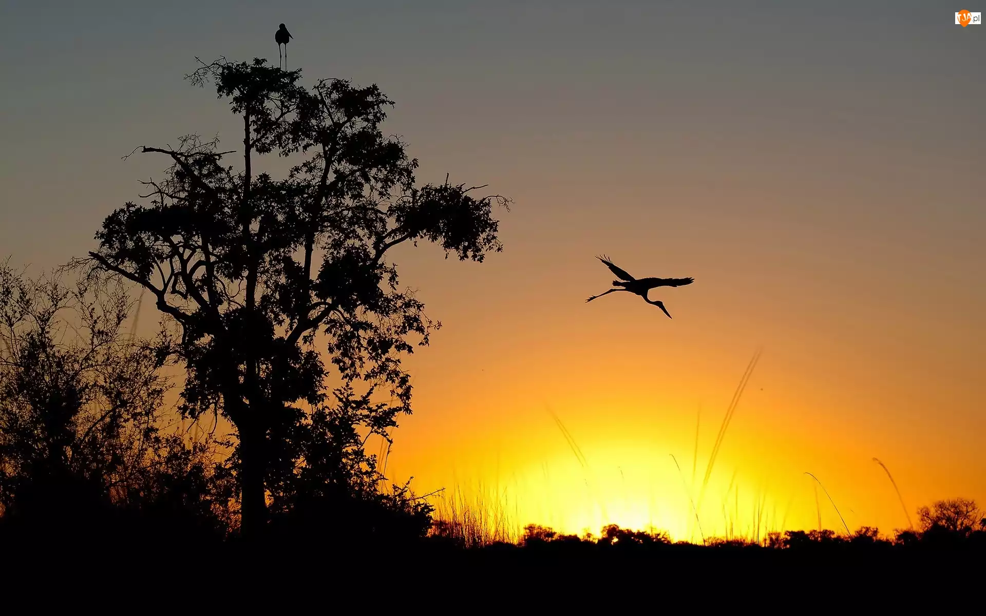 Zachód słońca, Ptaki, Łąka, Drzewa