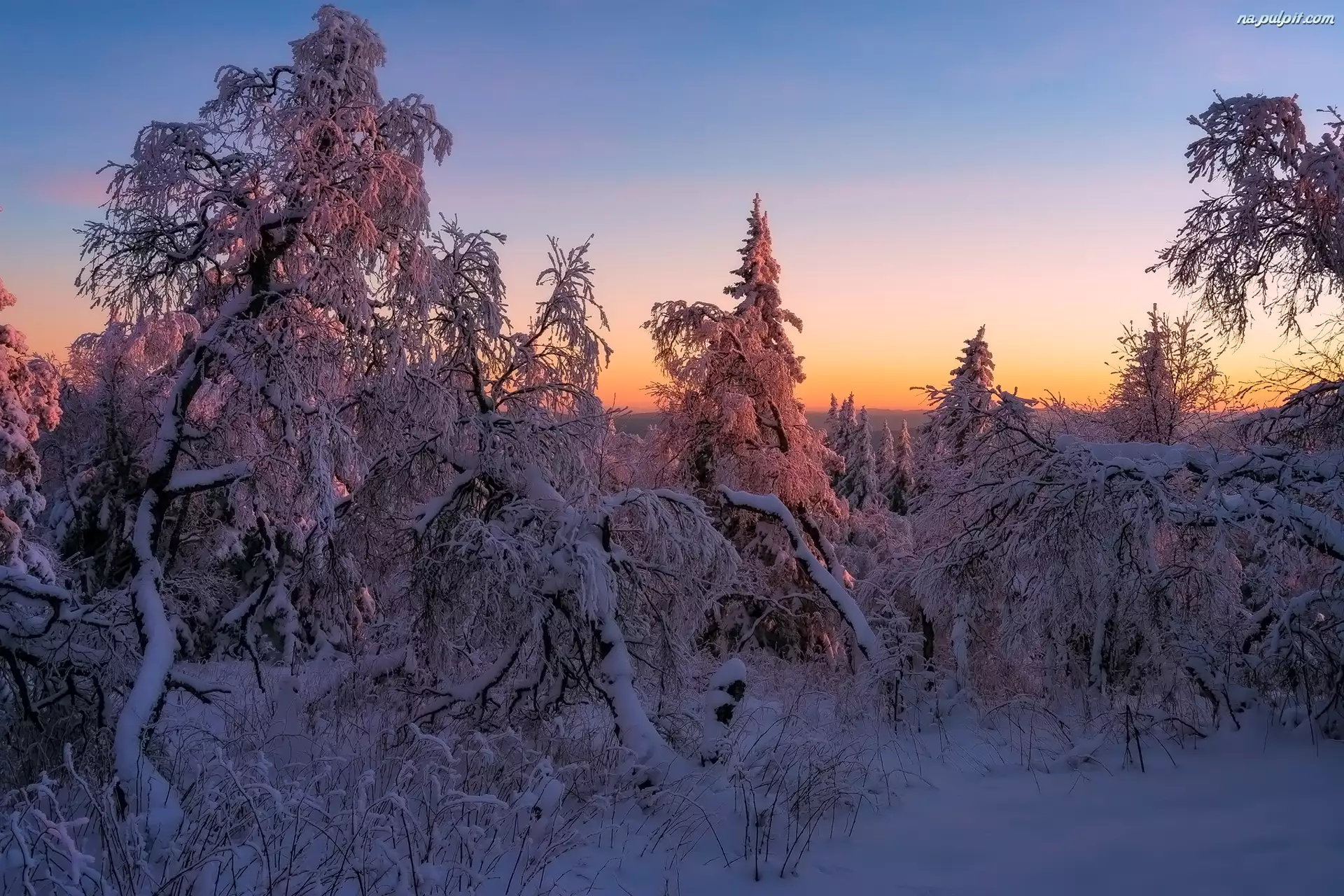 Zachód słońca, Ośnieżone, Drzewa, Zima
