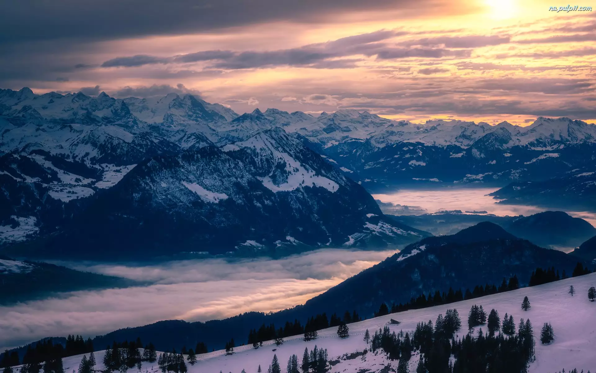 Zachód słońca, Zima, Drzewa, Chmury, Góry, Mgła, Szwajcaria, Prealpy