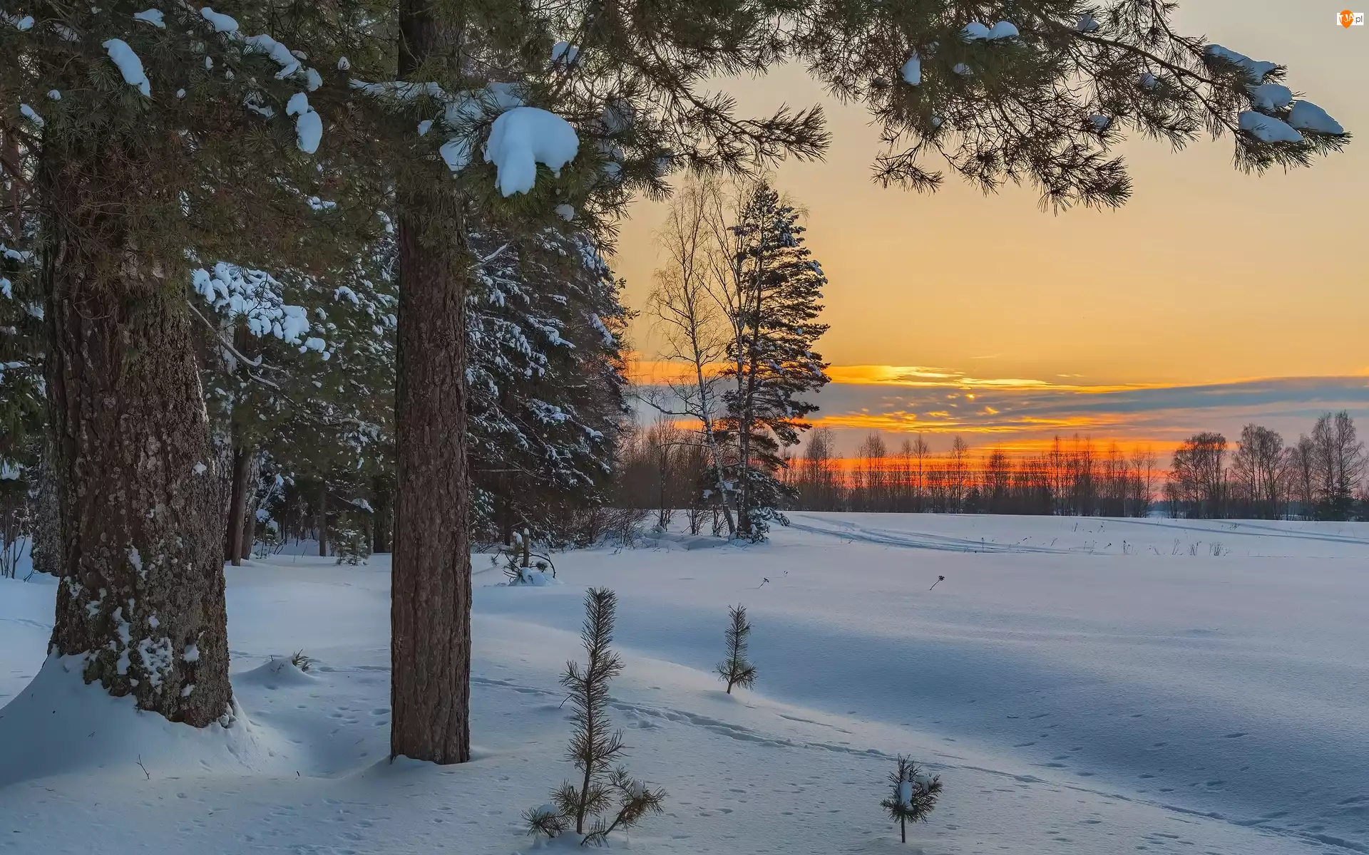 Zachód słońca, Zima, Śnieg, Drzewa iglaste