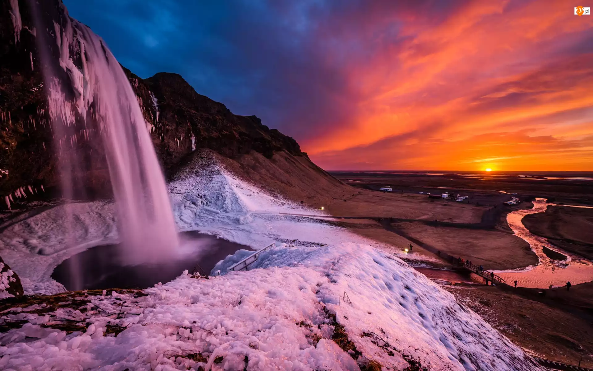 Zachód słońca, Zima, Wodospad, Islandia, Skały