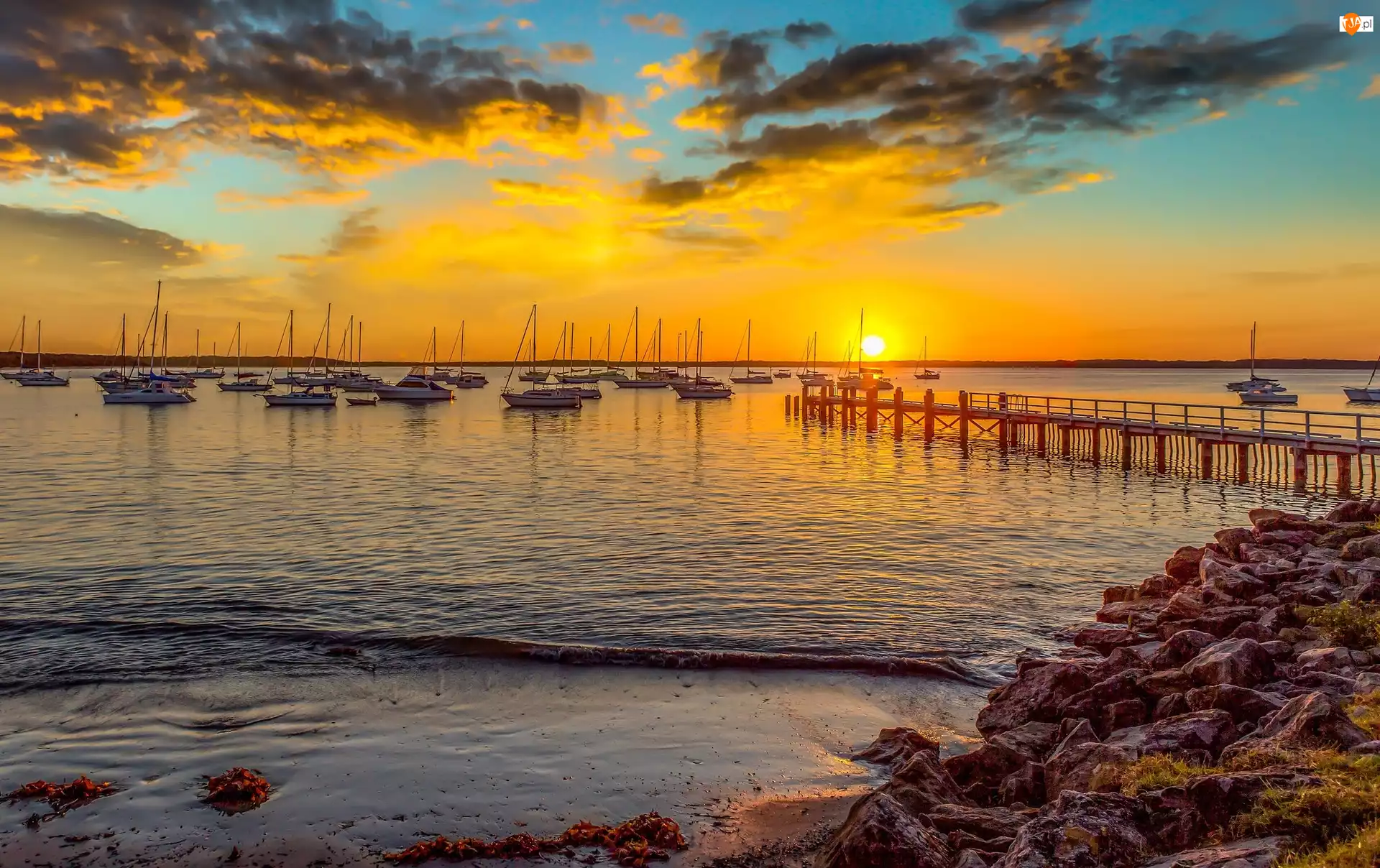 Zachód, Statki, Morze, Pomost, Kamienie, Słońca