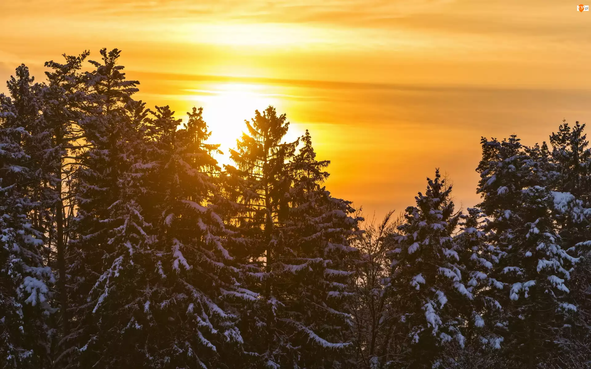 Zachód, Zima, Słońca, Świerki