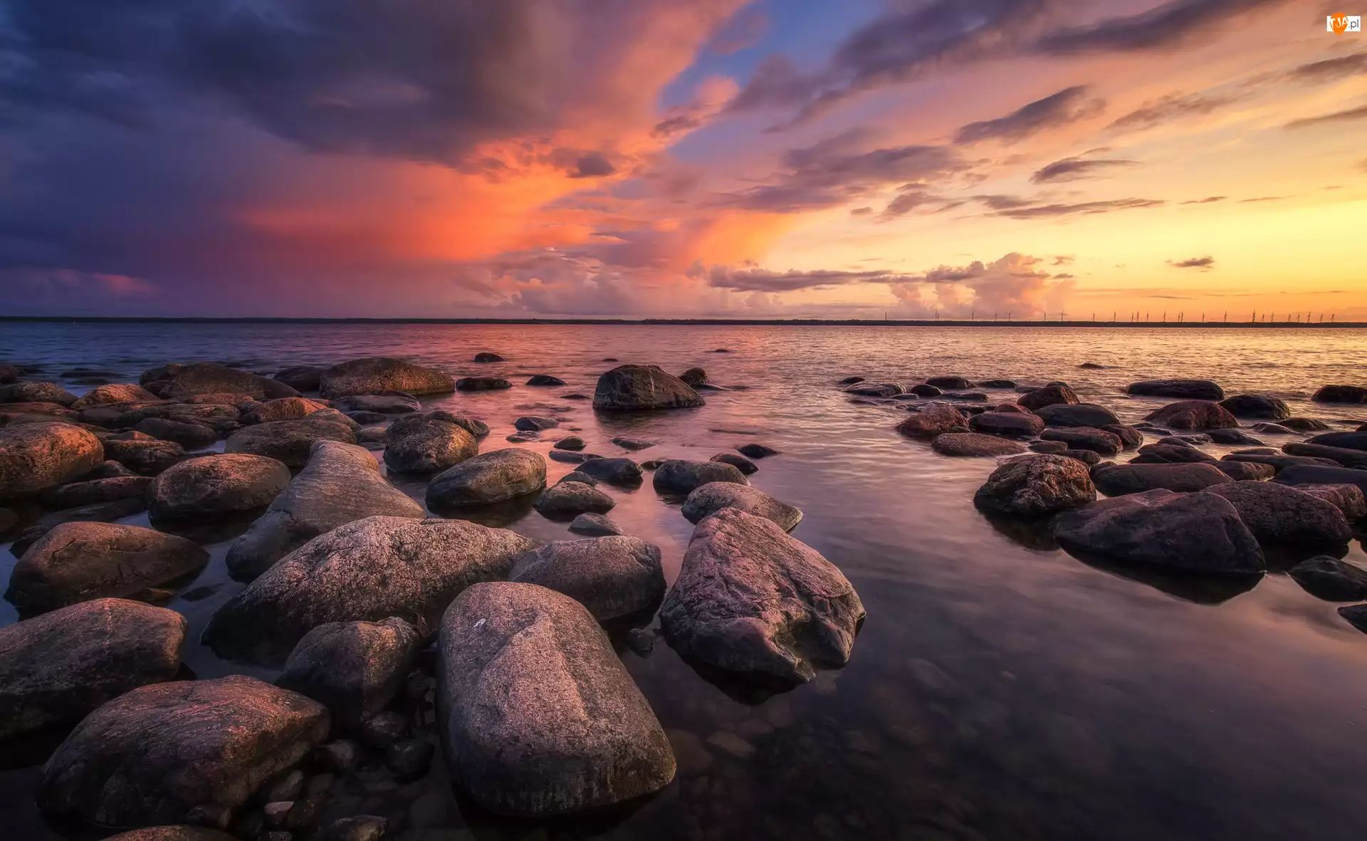 Kamienie, Chmury, Brzeg, Morze, Zachód słońca