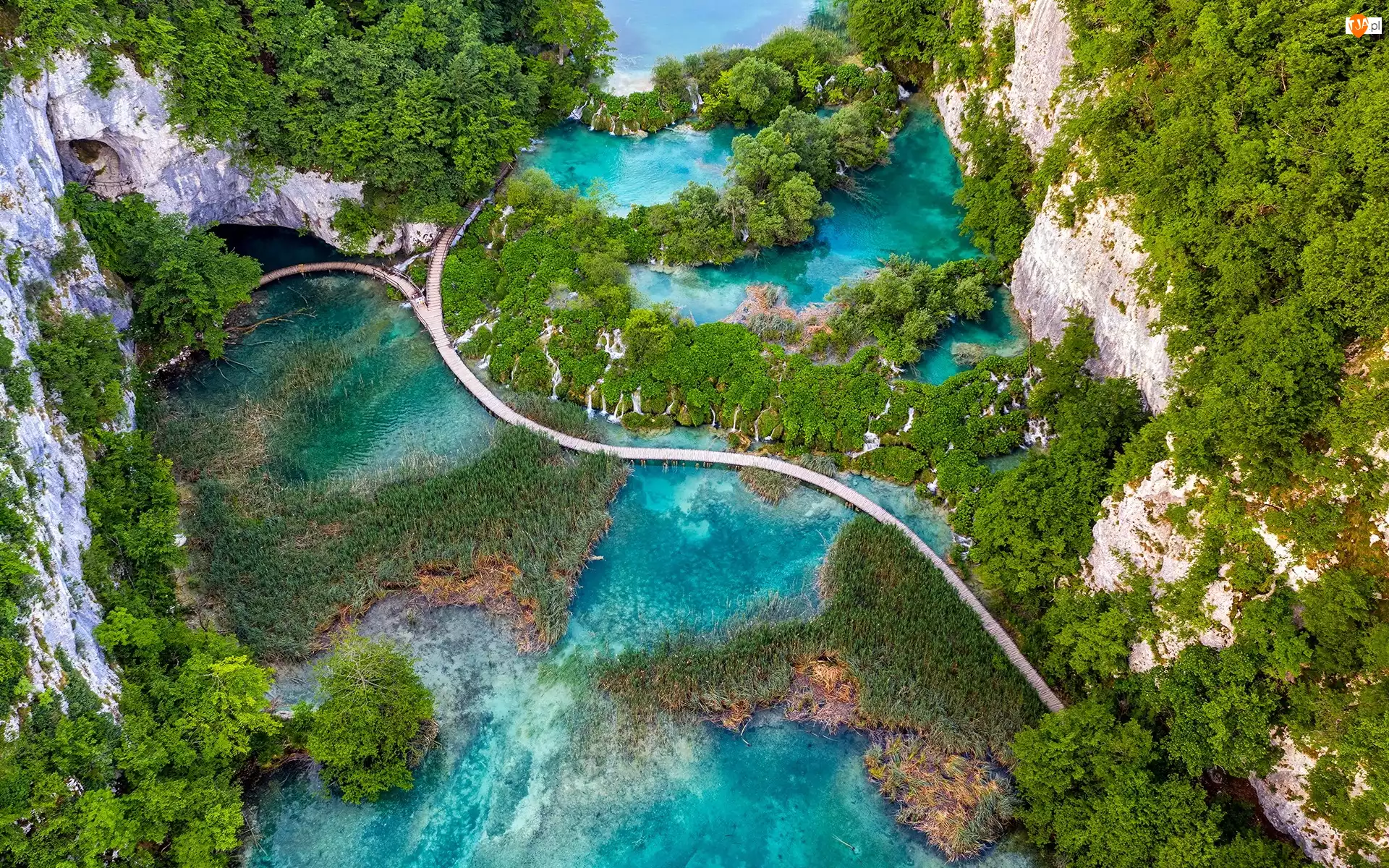 Jeziora, Park Narodowy Jezior Plitwickich, Zielone, Chorwacja, Wodospady, Drzewa