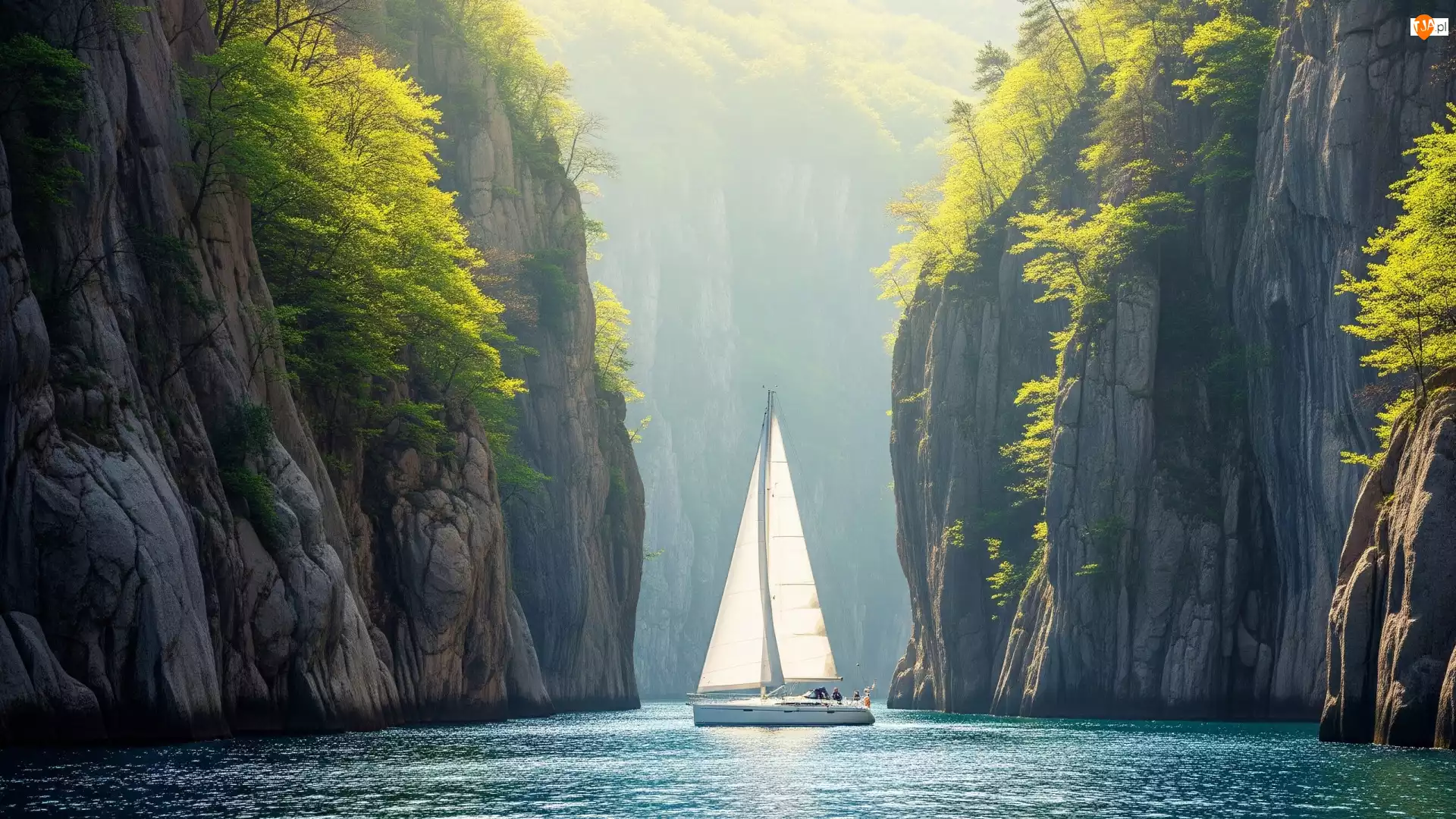 Żaglówka płynąca pomiędzy skałami
