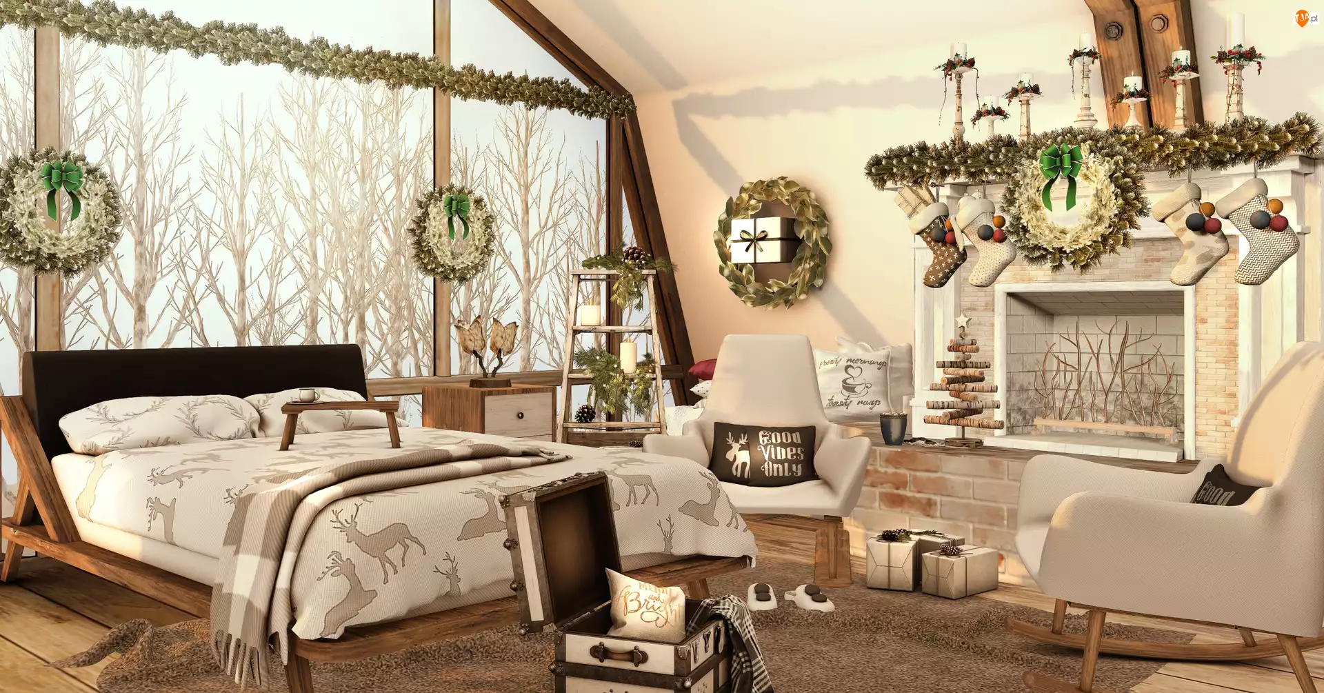 Łóżko, Sypialnia, Ozdoby, 2D, Meble, Świąteczne