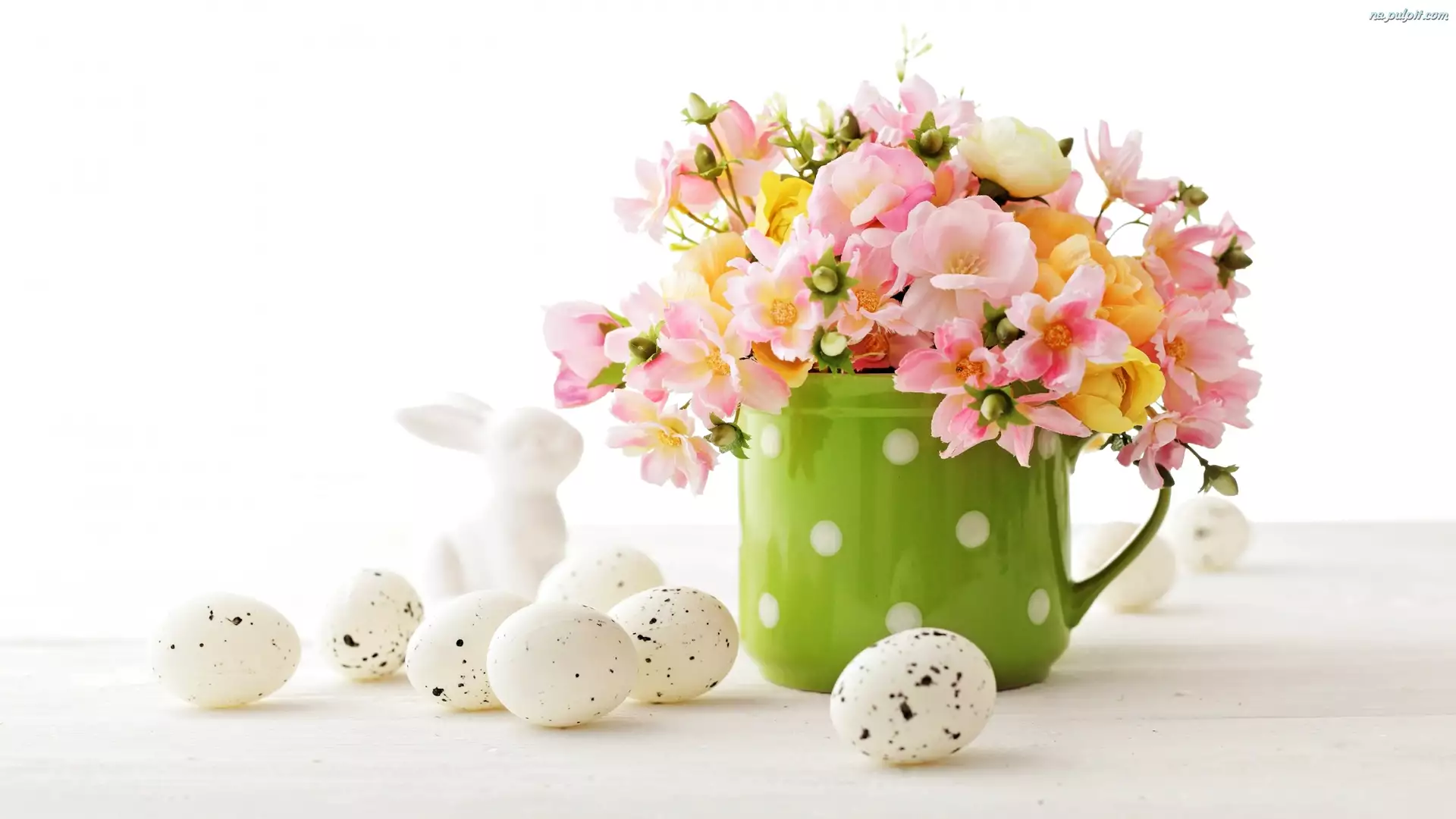 Bukiet, Kwiaty, Zajączek, Wielkanoc, Jajeczka, Kubek, Zielony