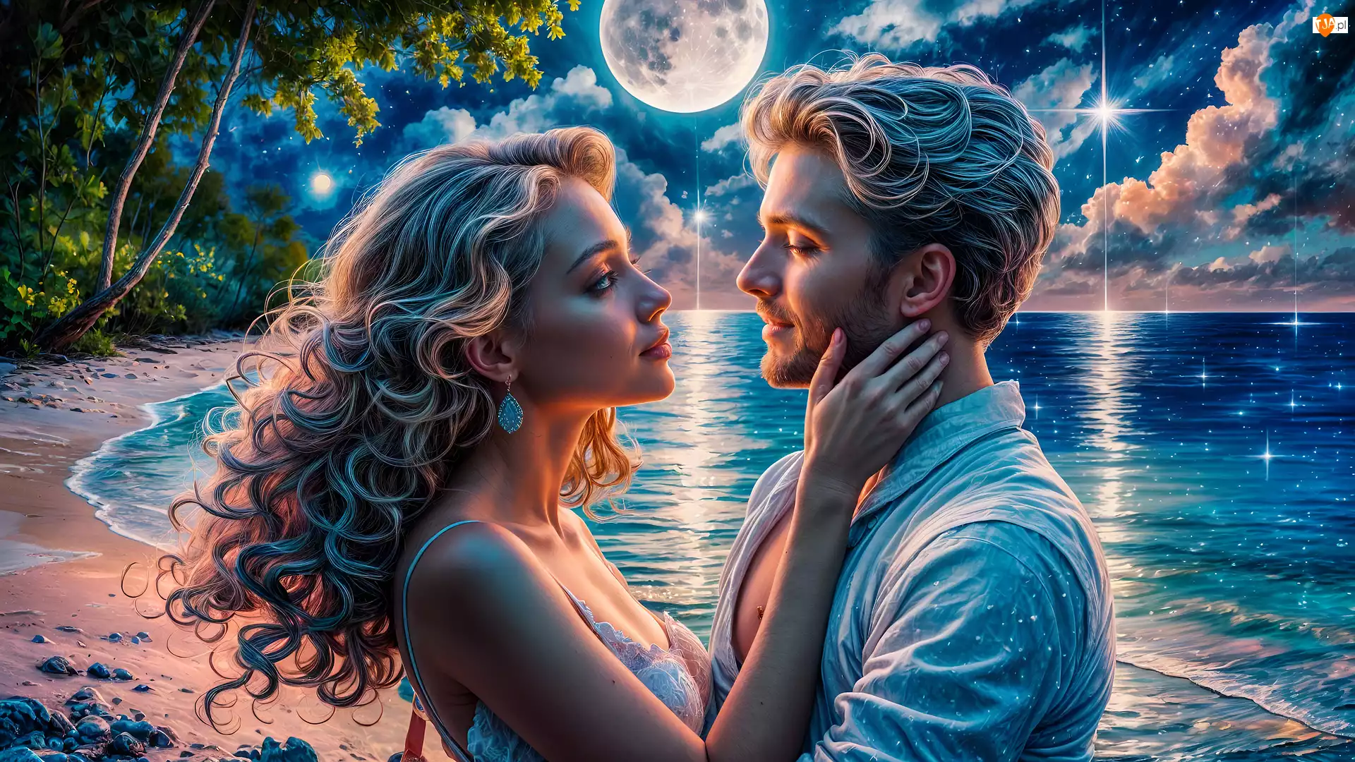 Księżyc, Kobieta, Zakochani, Gwiazdy, Mężczyzna, Morze, Grafika, Para