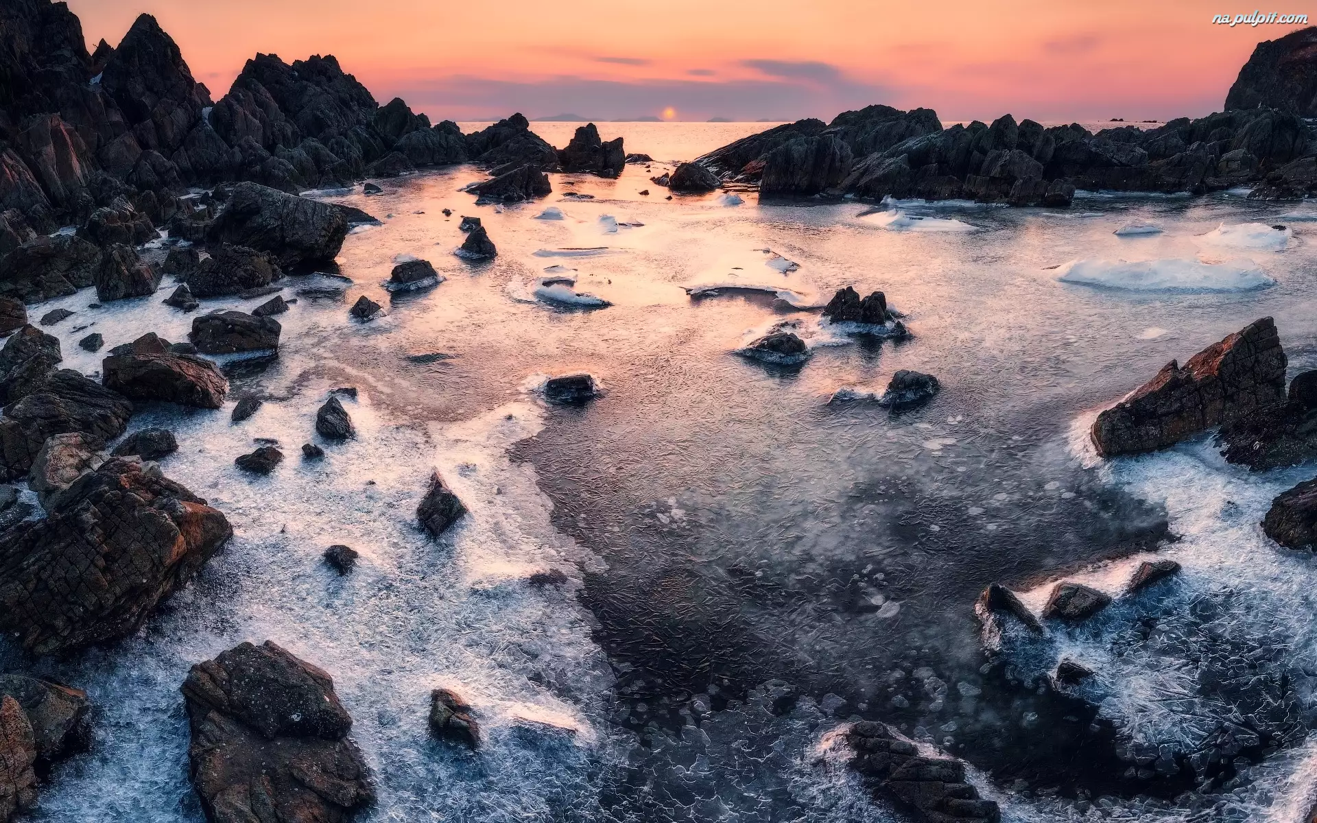 Brzeg, Lód, Rosja, Morze Japońskie, Kraj Nadmorski, Wschód słońca, Skały