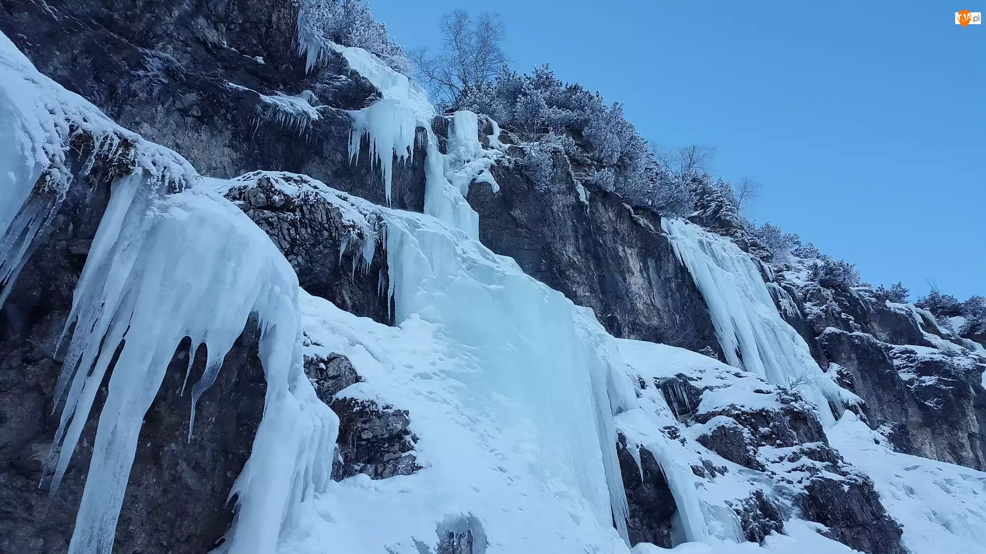 Śnieg, Roślinność, Zima, Skały, Wodospad, Sople, Lód