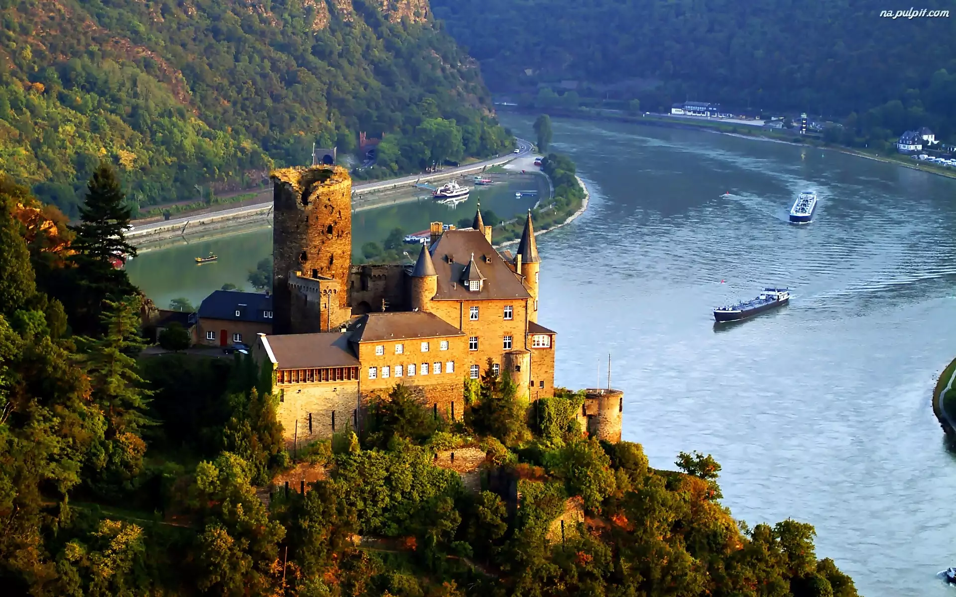 Burg Katz, Sankt Goarshausen, Góry, Zamek Katz, Statki, Niemcy, Rzeka Ren