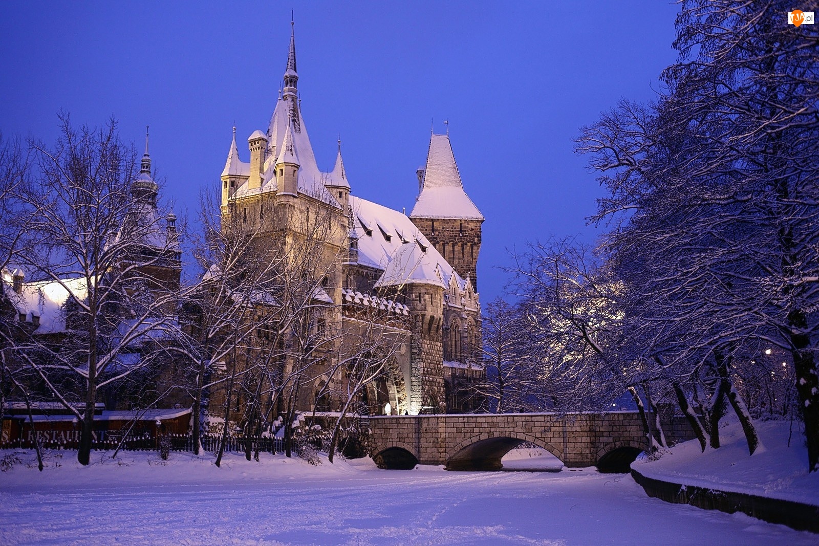 Zamek Vajdahunyad, Mostek, Budapeszt, Węgry, Zima