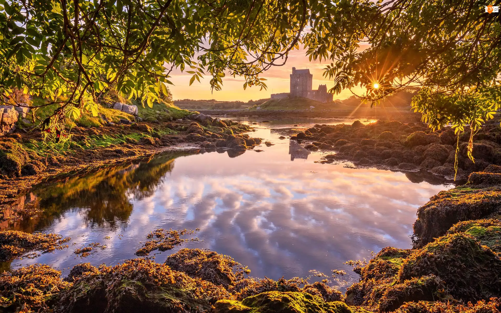 Drzewa, Irlandia, Zamek, Promienie słońca, Hrabstwo Galway, Dunguaire Castle, Zatoka Galway, Kinvara