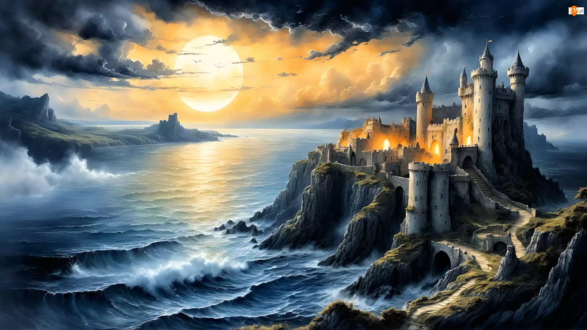 Morze, Skały, Fantasy, Grafika, Chmury, Słońce, Zamek