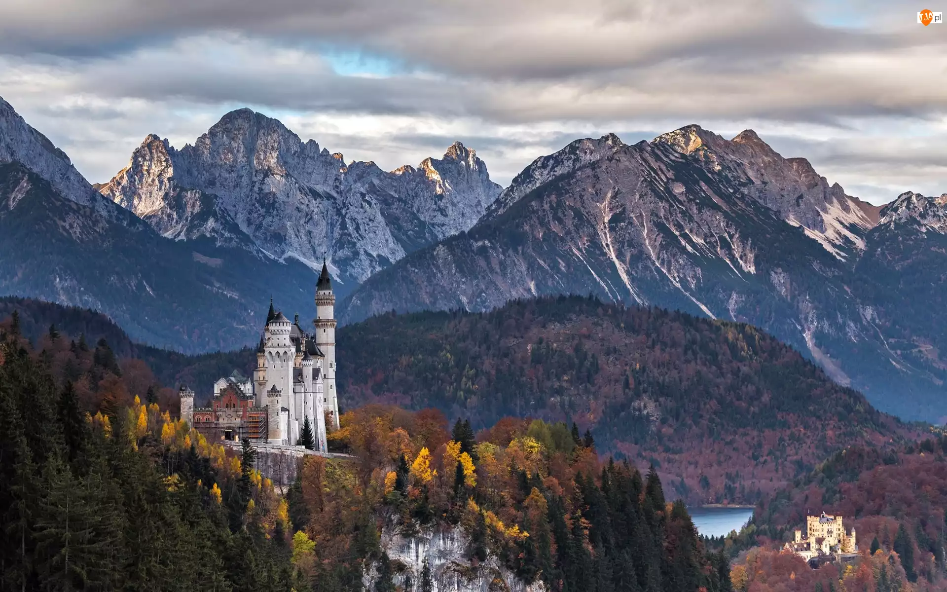 Chmury, Wzgórze, Alpy, Niemcy, Gmina Schwangau, Zamek Neuschwanstein, Lasy, Góry, Skały, Drzewa, Jesień, Bawaria