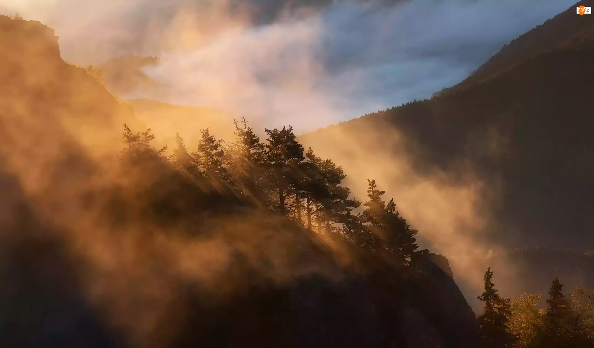 Rozświetlone, Mgła, Góry, Drzewa
