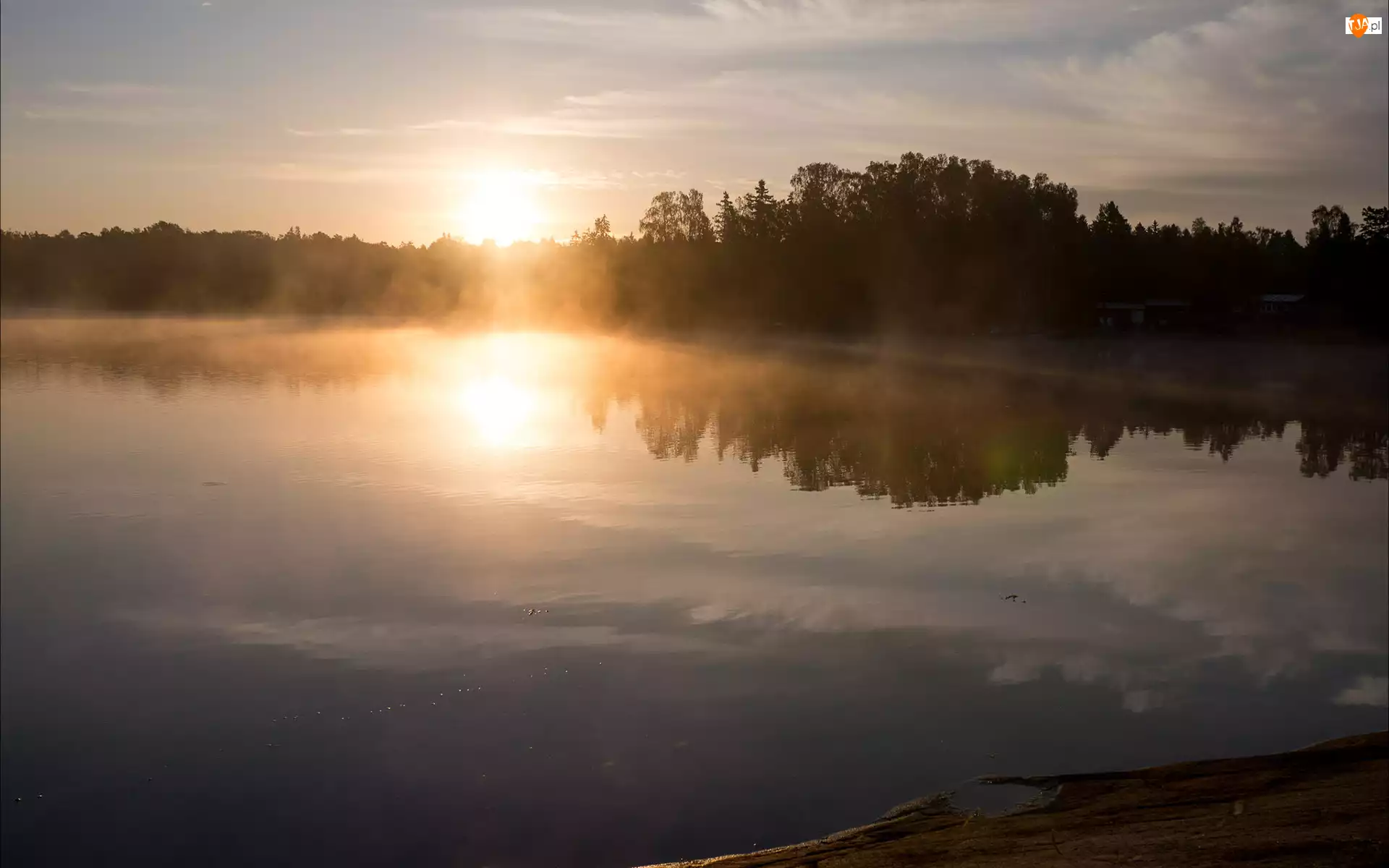 Odbicie, Jezioro, Mgła, Wschód słońca, Las