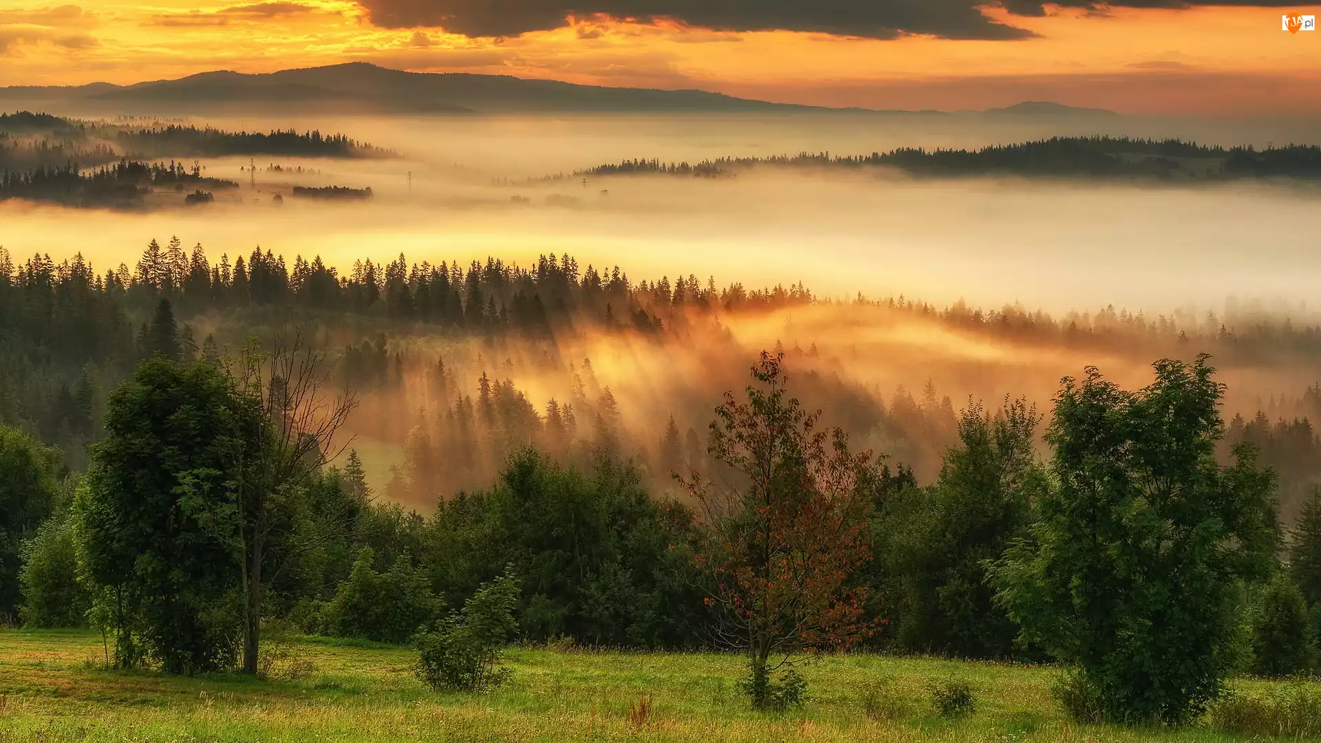 Lasy, Góry, Pole, Wschód słońca, Drzewa, Mgła
