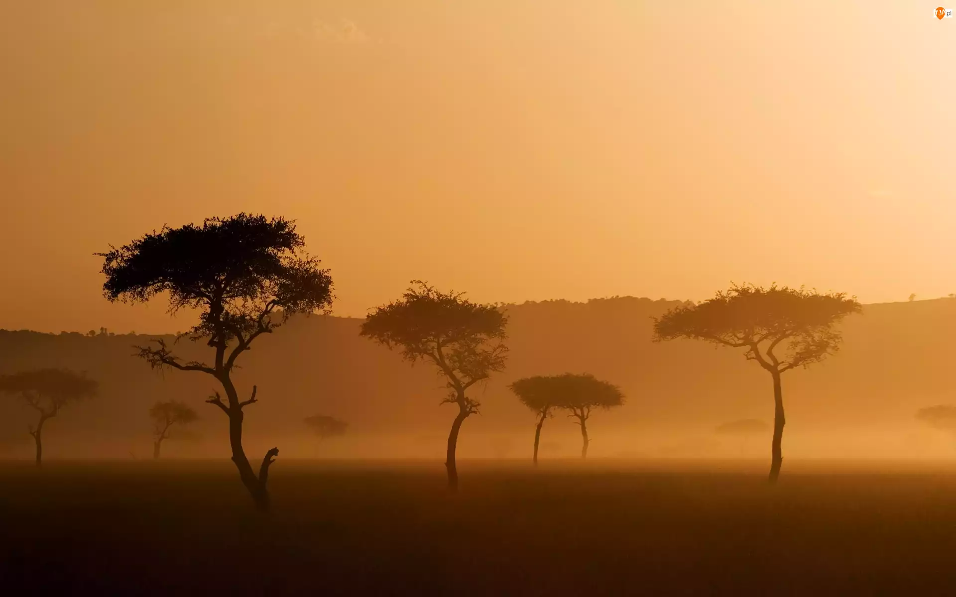 Zamglone, Sawanna, Drzewa, Poranek