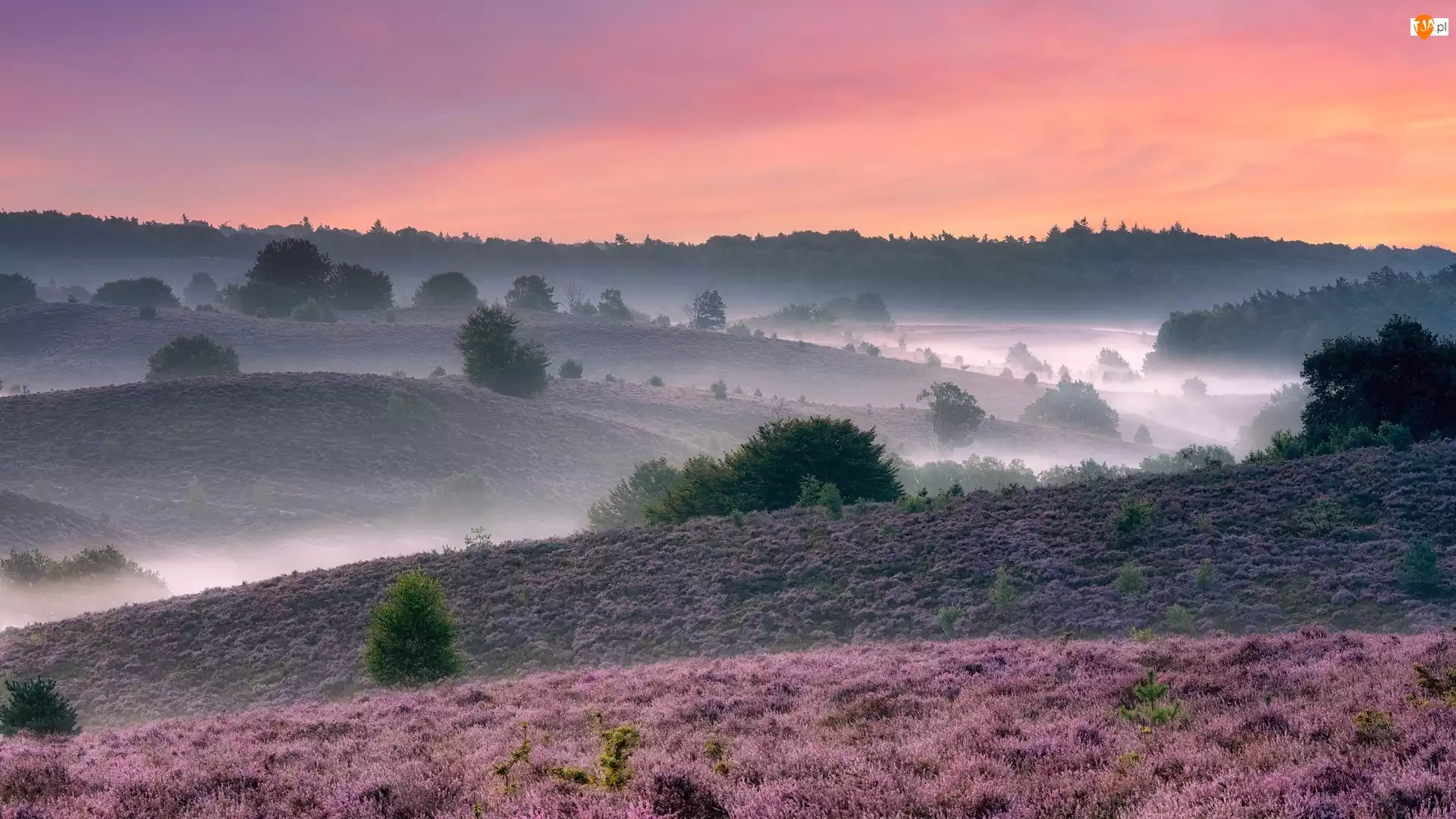 Drzewa, Wrzosowisko, Mgła, Wzgórza