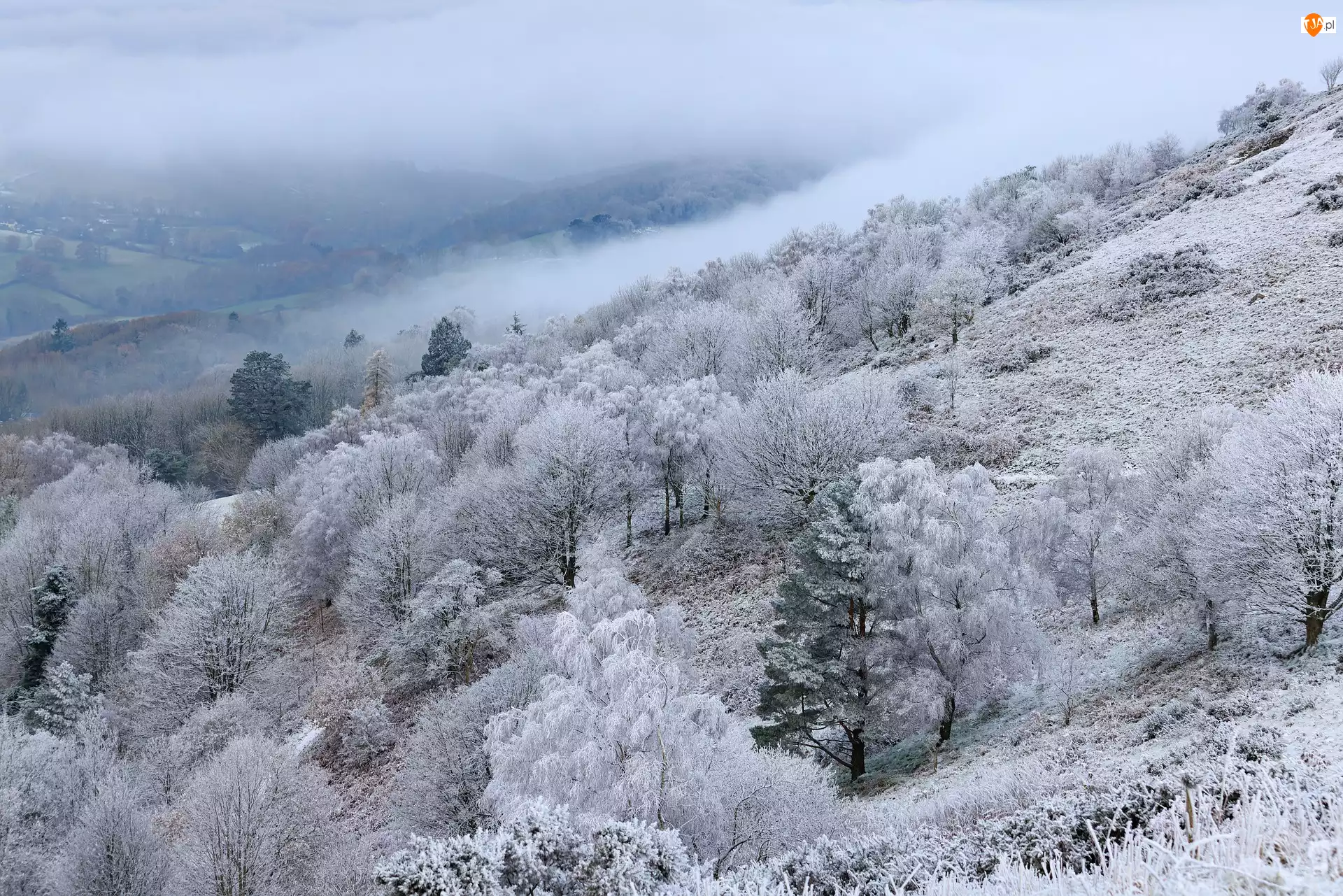 Wzgórze, Dolina, Drzewa, Zima, Mgła
