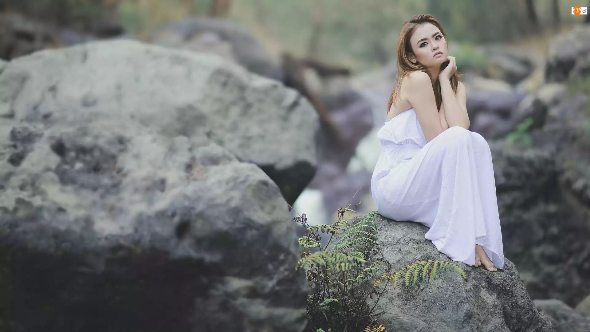 Biała sukienka, Skały, Kobieta, Kamienie, Zamyślona, Rośliny