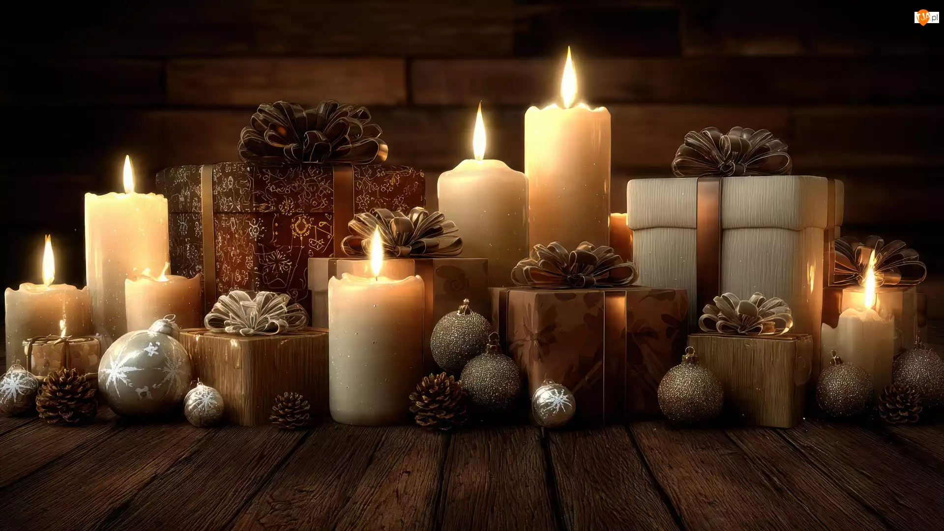 Świece, Boże Narodzenie, Szyszki, Deski, Prezenty, Bombki
