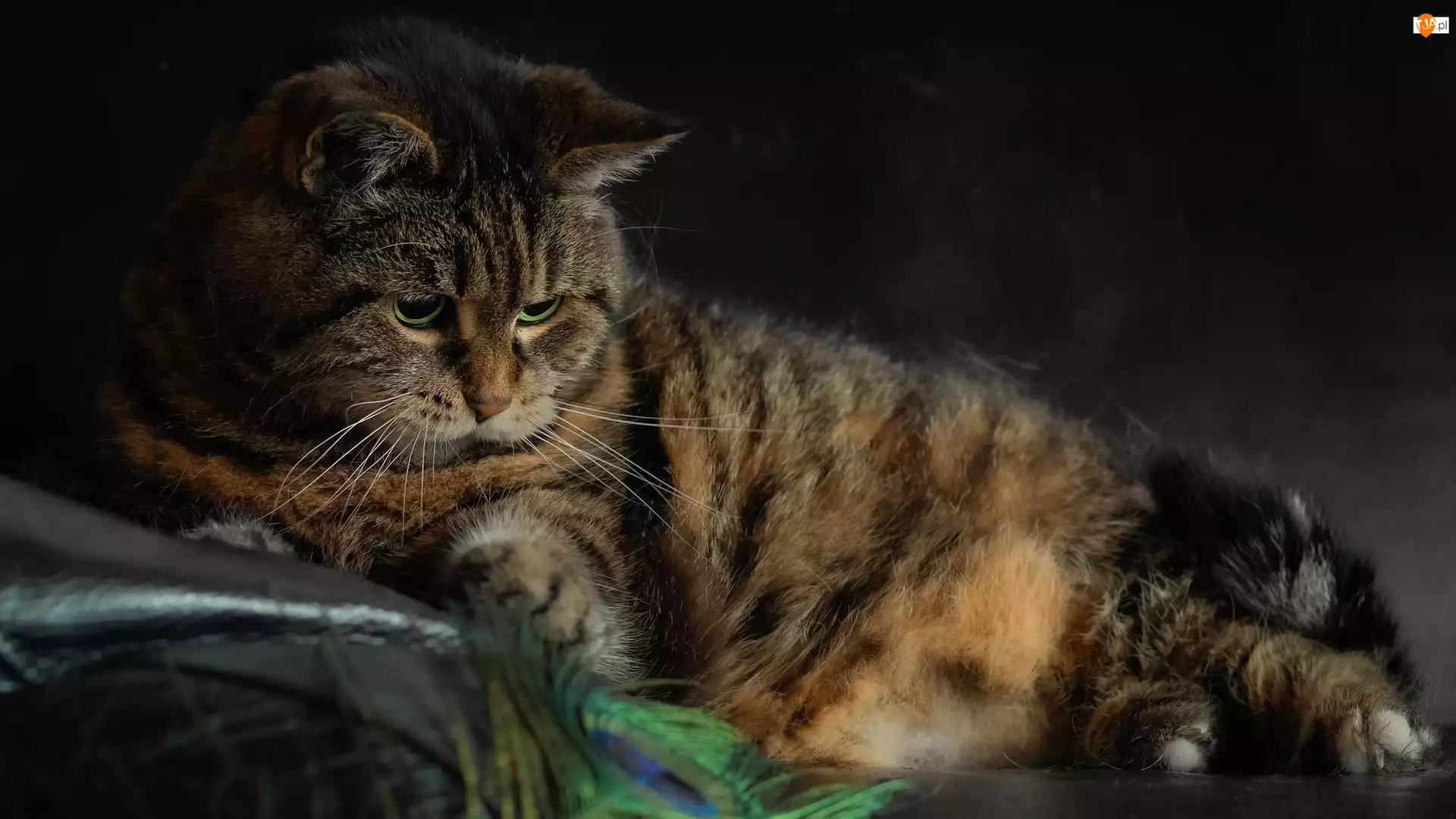 Zapatrzony na pióra bury kot