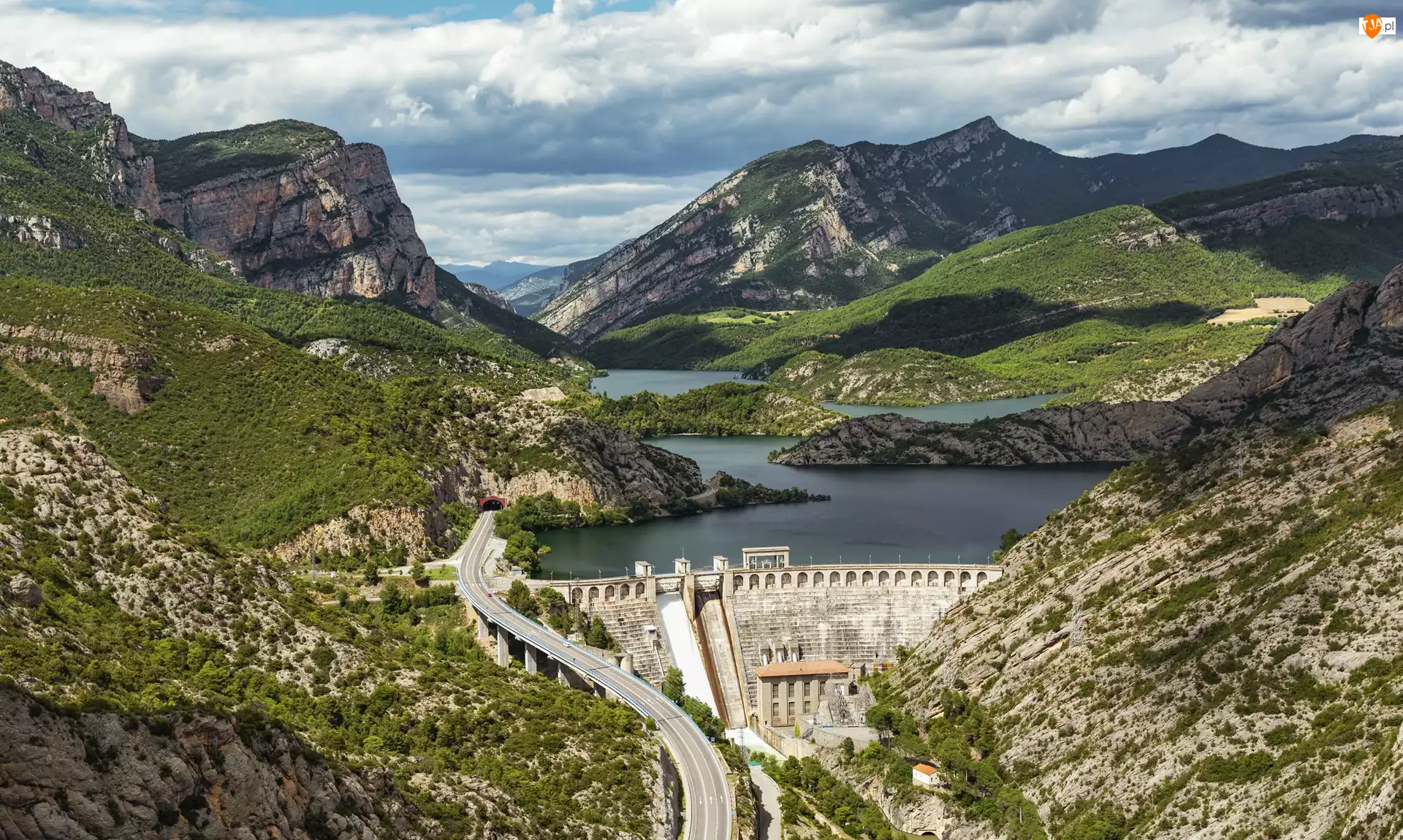 Zapora, Hiszpania, Most, Embalse de Oliana, Drzewa, Zapora, Katalonia, Prowincja Lleida, Góry, Zbiornik, Chmury, Tama, Jeziora