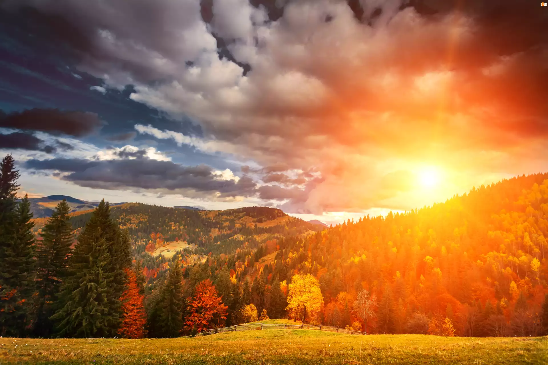 Góry, Zachód słońca, Jesień, Las
